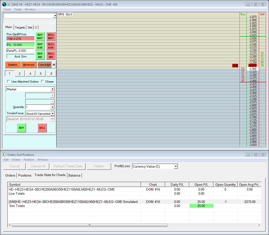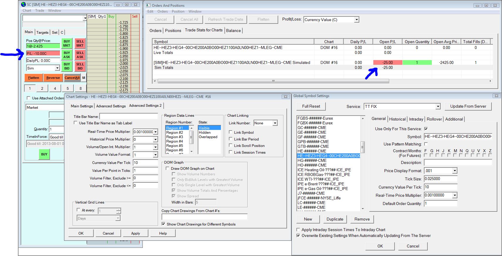 As shown in the attached screen capture, the P/L is being reported differently in the "Orders and Positions" window than in the DOM for an exchange traded spread. (The DOM has the correct value in this case.) The values are reported correctly when trading either of the outright contracts that make up this spread. The chart settings for price display format, tick size and currency value per tick are set the same for the DOM and for each of the individual contract charts.