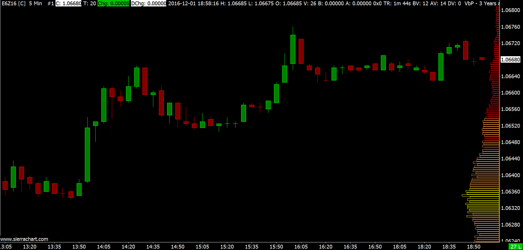 OK it just occurred to us what the problem is. The problem is that it is only this year, 2016, that the CME reduced the tick size to .00005. That is why you see the lower volume at that particular tick increment. We recommend increasing the Ticks per Volume Bar input with the study to 2. Sierra Chart Support - Engineering Level Your definitive source for support. Other responses are from users. Try to keep your questions brief and to the point. Be aware of support policy: https://www.sierrachart.com/index.php?l=PostingInformation.php#GeneralInformation For the most reliable, advanced, and zero cost futures order routing, *change* to the Teton service: Sierra Chart Teton Futures Order Routing Date Time Of Last Edit: 2016-12-02 11:11:55