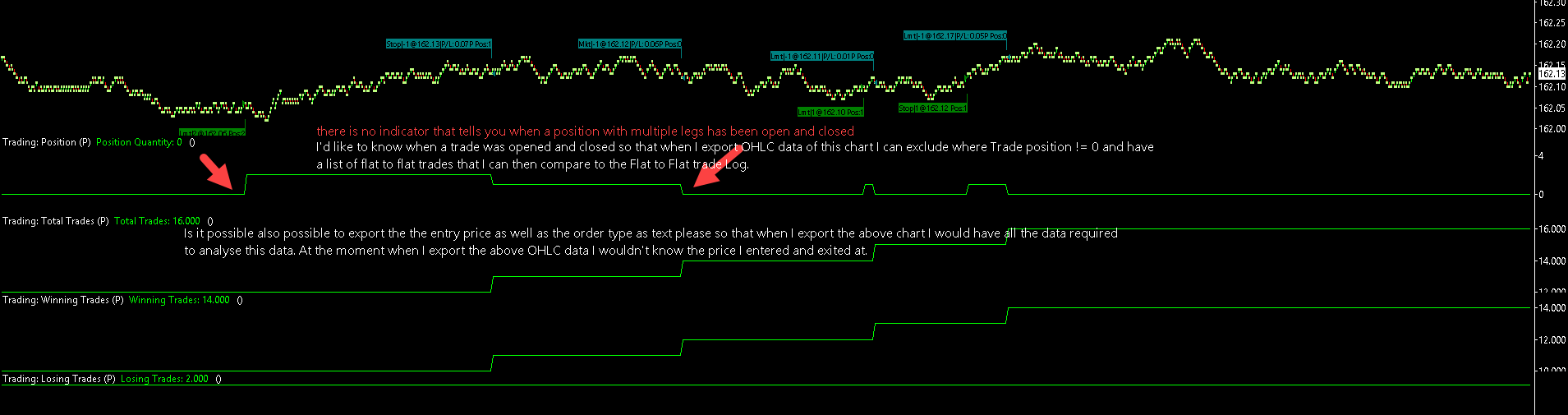 Ok I finally see the High and Low price while trade is open. Thank you so much for fixing this. However, I am seeing issues on a lot of entries, and I am attaching an example (highpricewhileopen.png). Can you comment on this please? Unfortunatley I can't use this data if it is not accurate. To answer your question, I am attaching a chart that would make the idea more clear. "We could add the capability for charts to use Flat to Flat order fill grouping instead of Fill to Fill." SC - Yes exactly this would partially solve the problem 1) I have added the comments on the chart directly. Basically what I am asking for is to have an indicator on chart that shows when a trade (possibly with multiple legs) was opened and flat again - so that when I export OHLC data of this chart I can exclude where Trade position != 0 and have a list of flat to flat trades that I can then compare to the Flat to Flat trade Log. 2) I am also asking if it is possible to export in text format combined with OHLC data, the fill price and Order type for each fill so that I know exactly the price I entered at for each leg. I hope this is more clear now. If you can sort the last 2 points I can get the data myself from tick data. Thank you for help. Date Time Of Last Edit: 2016-12-20 11:02:42