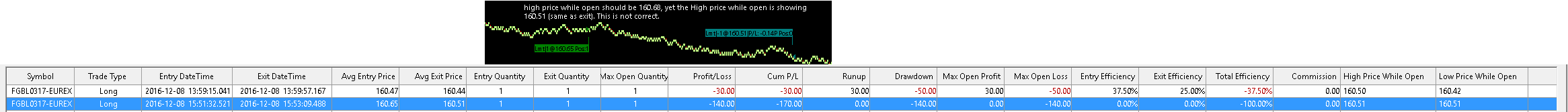 One thing we realize is that when using Flat to Flat order fill grouping, the High/Low Price While Open fields are not displayed. This has been fixed in version 1500. At this time we recommend updating to that version. most importantly a "flat to flat" trade open and trade close subgraph or study? This is not clear for us.We could add the capability for charts to use Flat to Flat order fill grouping instead of Fill to Fill. Sierra Chart Support - Engineering Level Your definitive source for support. Other responses are from users. Try to keep your questions brief and to the point. Be aware of support policy: https://www.sierrachart.com/index.php?l=PostingInformation.php#GeneralInformation For the most reliable, advanced, and zero cost futures order routing, *change* to the Teton service: Sierra Chart Teton Futures Order Routing Date Time Of Last Edit: 2016-12-20 00:53:22