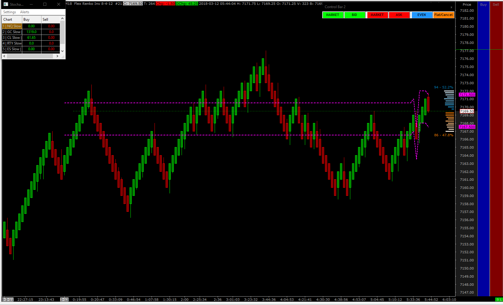 I found this study collection you created for another user when I was searching for something similar. Thinking this would accomplish what I needed I tried it this morning and although the Study Subgraph Add does draw offset lines based on the Current Price Line study as you configured, the offset lines it creates don't shift up and down with the current price, they paint the prior price as the current price changes and quickly make a mess of the chart. Is there a way to "bracket" an offset to the current price line study that moves up and down exactly like the current price line does without painting the line permanently on the chart? Ideally, including an Offset Input on the Current Price Line study would allow us to create brackets that move with current price if possible. I've attached a chart to illustrate what happens when price begins to move with this current study collection. Thanks much -- Scott |