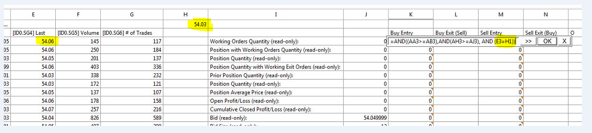 Cool thanks :) Should the attached formula work? I'm trying to have a set price 53.03 trigger Entry when two other conditions are true. The price is in cell H1, and using Last Price in cell E3. If not, is there a better way to trigger an Entry at a set price, pls. |