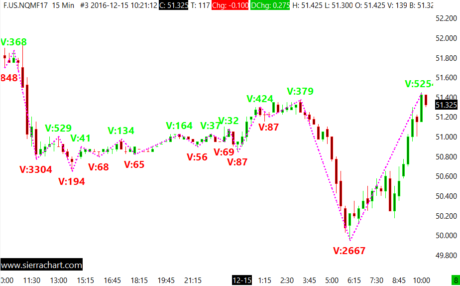 Are you referring to this highlighted location: http://www.sierrachart.com/image.php?Image=1482404439495.png This makes sense according to the description: http://www.sierrachart.com/index.php?page=doc/TechnicalStudiesReference.html#ZigzagCalculationMode2 Read through description and specifically note the application of the Number of Bars Required for Reversal Input. Sierra Chart Support - Engineering Level Your definitive source for support. Other responses are from users. Try to keep your questions brief and to the point. Be aware of support policy: https://www.sierrachart.com/index.php?l=PostingInformation.php#GeneralInformation For the most reliable, advanced, and zero cost futures order routing, *change* to the Teton service: Sierra Chart Teton Futures Order Routing Date Time Of Last Edit: 2016-12-22 11:02:39