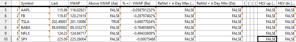 3. Is it possible to program an algorihm so that the sacnner only shows charts that match that algorithm ? is it possible to use the scanner (or any other feature) to extract those charts from a universe of stocks. There is another solution to your problem. -Load all charts into a chart book( universe) -Load a spreadsheet study to each chart -Create simple alerts conditions for each chart, or create more advanced alerts using formulas in columns of each charts spreadsheet -Setup a Master sheet that makes reference to alert columns from each individual charts spreadsheet -Each row/ column in the master sheet would make reference to each individual charts spreadsheet, and formulas would be used in each respective column so that alerts are displayed as = TRUE/FALSE values So you are basically creating a real-time tabulated watchlist and each row would reference each symbol in your chartbook( universe) and each column would reference the alerts you have setup for each chart, and would = TRUE if each condition was met. |