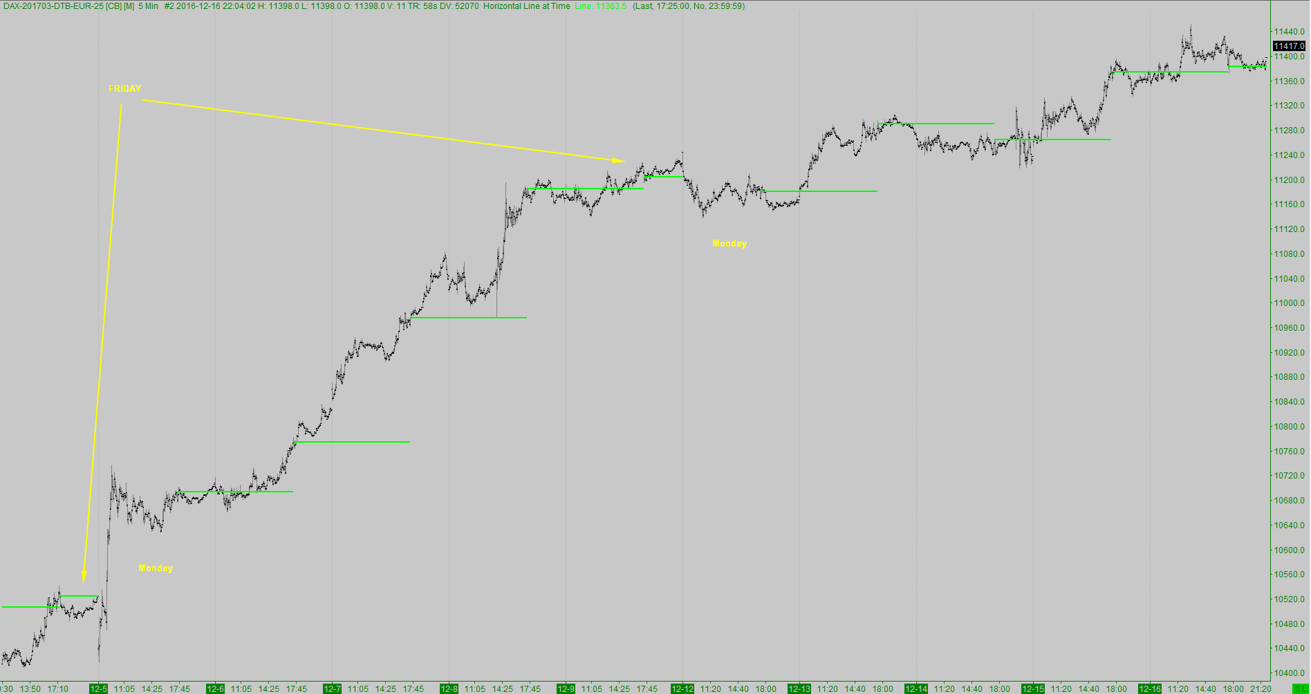 Hello, I was doing some study over the weekend using the Horizontal Line At Time indicator and wondered if I may be using it wrong? I have just entered in a start time and set the use stop time to be NO. My understanding was that the indicator should draw a horizontal line until the next start time is encountered. This mostly happens except on a Friday where the horizontal line does not continue into the Monday. Is that the intended behavior? https://www.sierrachart.com/index.php?page=doc/TechnicalStudiesReference.html#s306 With kind regards, MK |