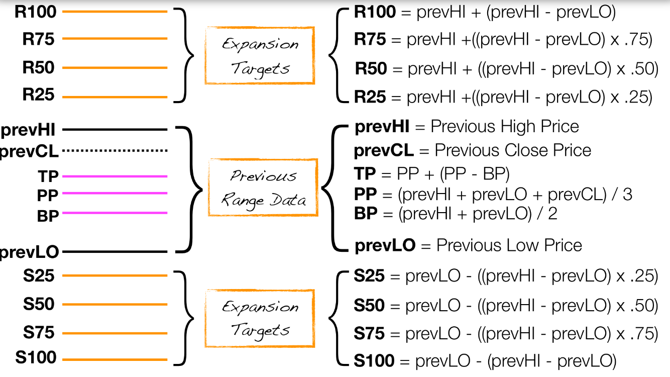 I would like to create horizontal lines on my chart for the below expansion targets, which will update every day. previous high +(previous high - previous close) x.25 x.50 x.75 previous low - (previous high - previous close) x.25 x.50 X.75 So a total of 8 lines Could you please help? Date Time Of Last Edit: 2016-12-21 07:24:26