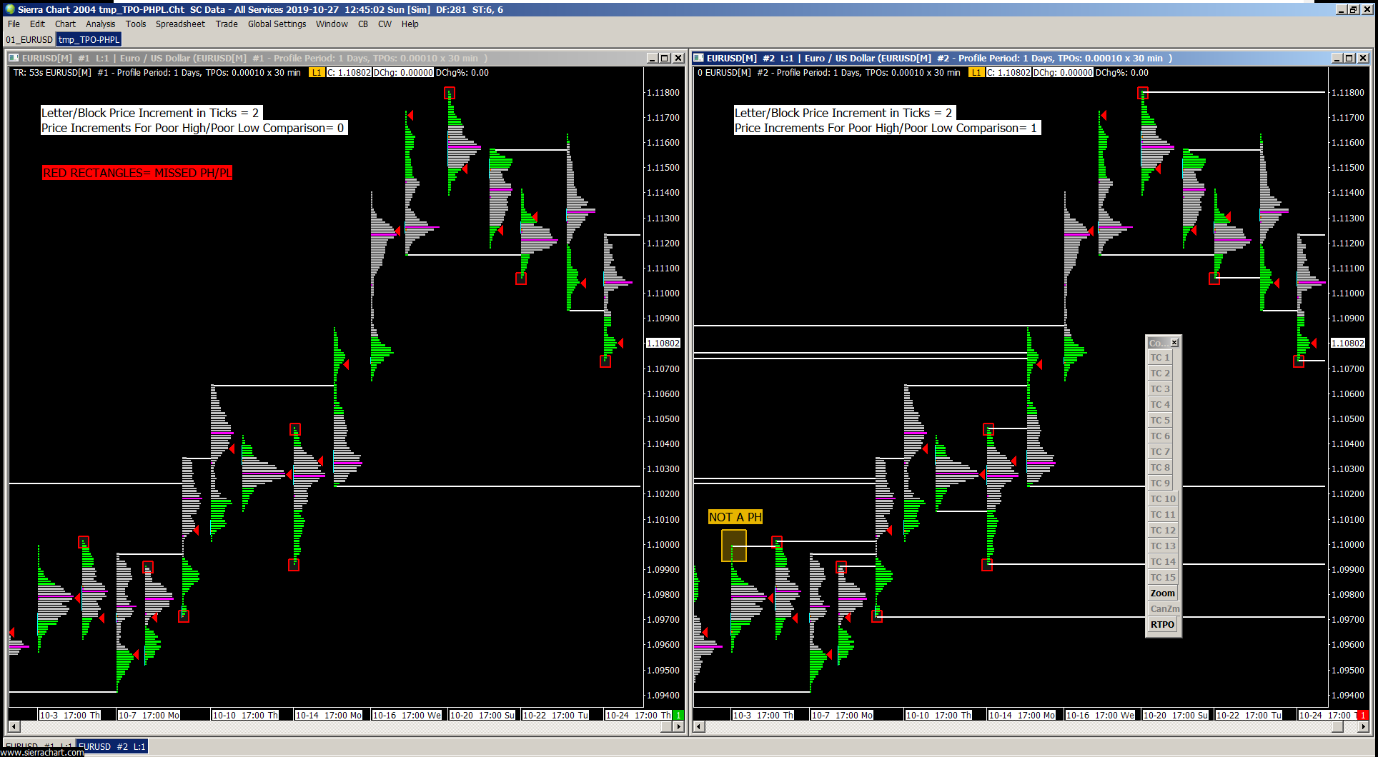 pre-release 2004 Thanks for this implementation, probably it needs some tweaking. With "Price Increments For Poor High/Poor Low Comparison" = 0 some PH/PL are missed. (left chart) With "Price Increments For Poor High/Poor Low Comparison" = 1 all (i think ... ) missed PH/PL are drawn but there is a wrong PH (yellow rectangle on the right chart). And please, as request, add possibility to choose 2 different colors to precisely identify PH and PL extension lines. TY |