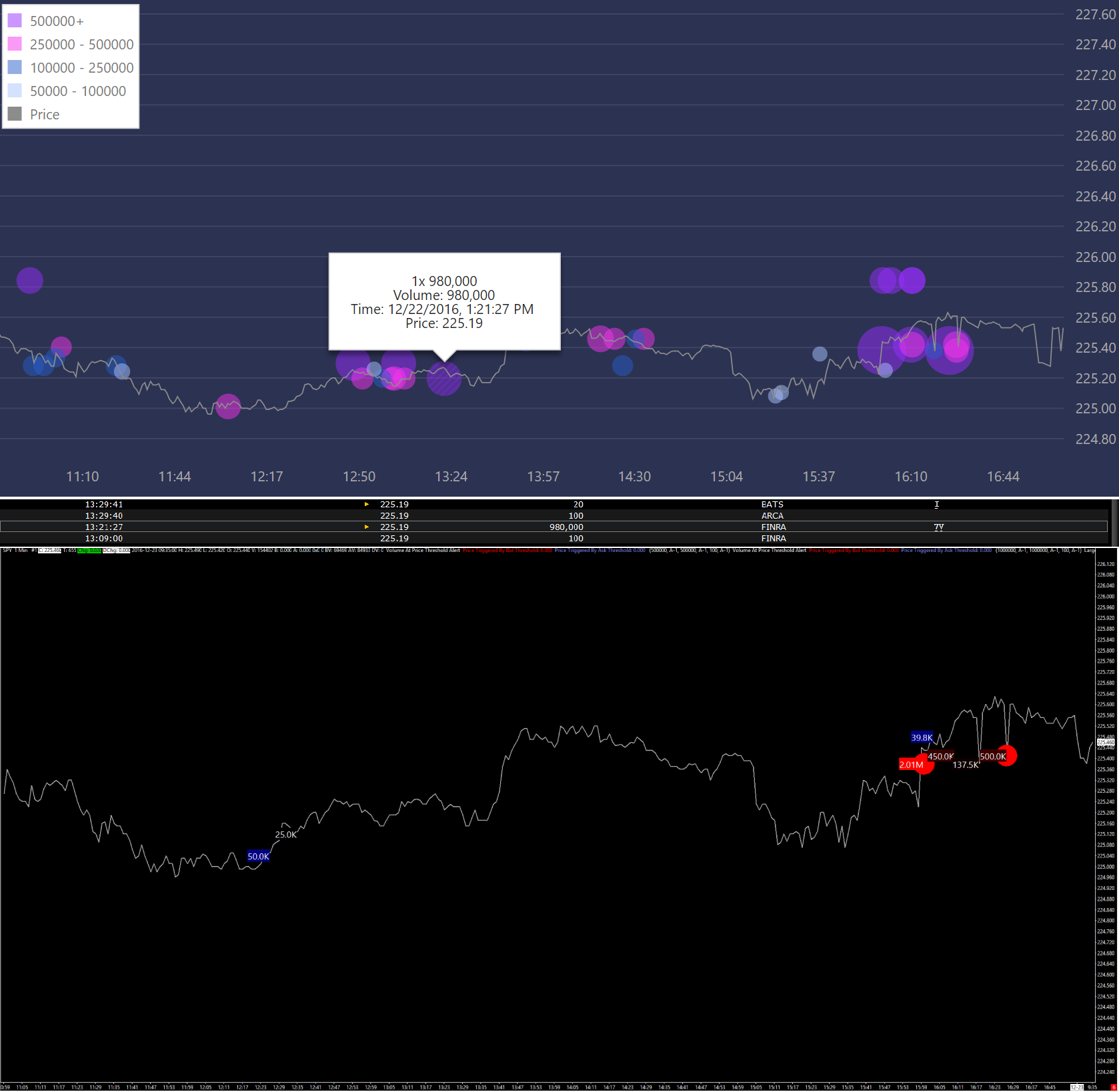 These trades can be reported to the SIP moments later and appear on the raw consolidated tape. Brokers who route to dark pools will report the transactions in T&S ( eg Interactive brokers), but a typical retail data vendor( IQ feed) will filter them out and class them as a Non-last-qualifying trade. -What is your stance on these type of trades? -Does the SC data feed report the FINRA ATS/ Non-ATS dark pool trades? -I can see that they are not currently reported based on intra-day data, however, is this because they are being filtered out? Attached is an example to show the extent to which these trades appear and are reported by the likes of IB Vs what would be displayed in the SC data feed. |