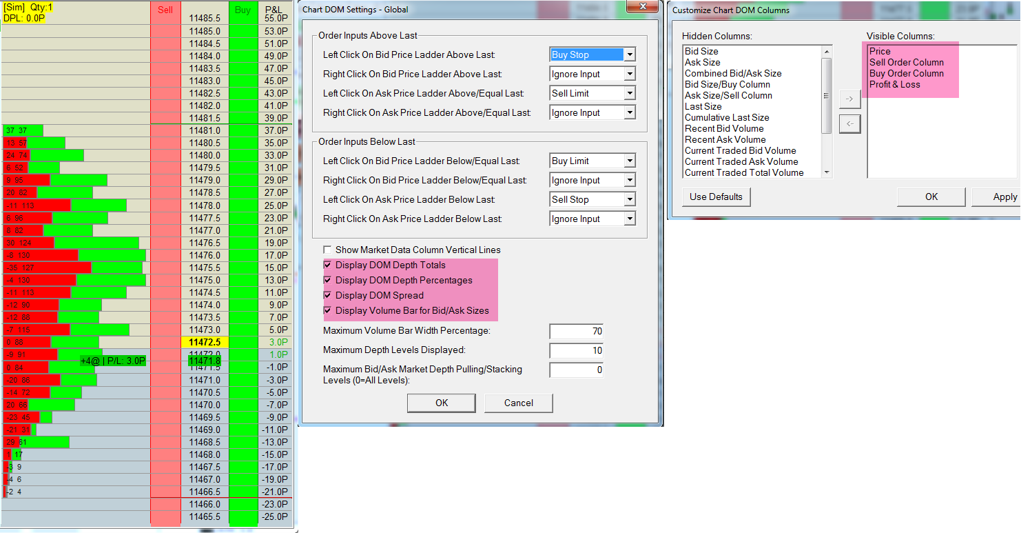 You are modifying the Chart DOM columns and not the Trade DOM columns. You need to use Global Settings >> Customize Trade DOM Columns instead. And you need to add the Bid Size and Ask Size columns as well. Refer to: Chart Trading and the Chart DOM: Customizing Trade DOM and Chart DOM Columns Sierra Chart Support - Engineering Level Your definitive source for support. Other responses are from users. Try to keep your questions brief and to the point. Be aware of support policy: https://www.sierrachart.com/index.php?l=PostingInformation.php#GeneralInformation For the most reliable, advanced, and zero cost futures order routing, *change* to the Teton service: Sierra Chart Teton Futures Order Routing |