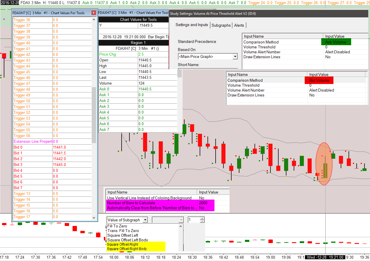 The Study „Volume at Price...V2“ ist a wonderful tool. Many thanks but from my point of view there are some points I would improve. - In practice, this study is difficult to work with because the information content is very limited. I use the chart header and also Chart Value Window as an information source. Here in my example I prepared 7 triggers only. One Study for Ask Volume and one Study for Bid Volume. To switch off all other Triggers (8 – 56) for the Header and the Chart Values Windows is not manageable (try by yourself). At the moment I do not understand the logic to switch off correctly. - It would be very helpful to use the function “Number of Bars to Calculate” and “Automatic clear...” - Furthermore, it would be very helpful to extend the Draw Style by adding "Square Offset Right" and "Square Offset Right Body" esp. if you use the Study two or more times. Many thanks |
