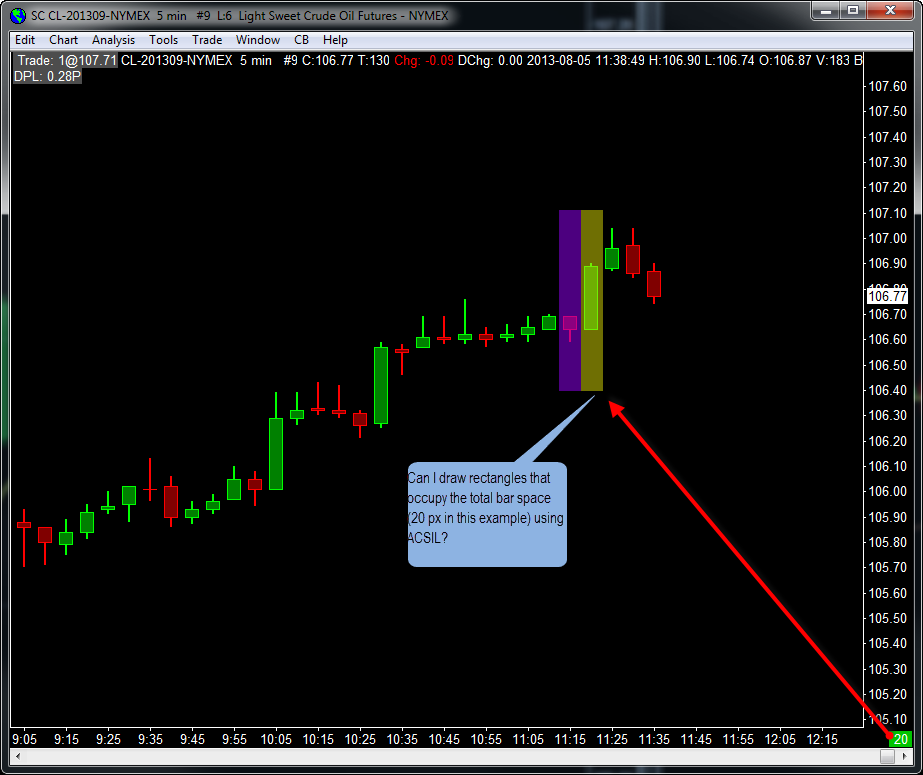 Is it possible (using ACSIL) to draw rectangles that occupy all of the bar space? I have tried stuff like: tool1.BeginDateTime = sc.BaseDateTimeIn[sc.Index] - (sc.SecondsPerBar * SECONDS)/2; tool1.EndDateTime = sc.BaseDateTimeIn[sc.Index] + (sc.SecondsPerBar * SECONDS)/2; Needless to say, it doesn't work. I'd appreciate any ideas on how to accomplish this. EDIT: I can't use "background color" for this as I will be drawing several different rectangles vertically (not shown in the attached image). Date Time Of Last Edit: 2013-08-05 21:02:42