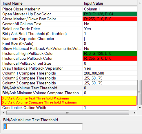 What exactly should this do and why?: - Bid/ Ask Volume Text Threshold Maximum - Bid/ Ask Volume Compare Threshold Maximum Sierra Chart Support - Engineering Level Your definitive source for support. Other responses are from users. Try to keep your questions brief and to the point. Be aware of support policy: https://www.sierrachart.com/index.php?l=PostingInformation.php#GeneralInformation For the most reliable, advanced, and zero cost futures order routing, *change* to the Teton service: Sierra Chart Teton Futures Order Routing Date Time Of Last Edit: 2017-01-02 17:43:26