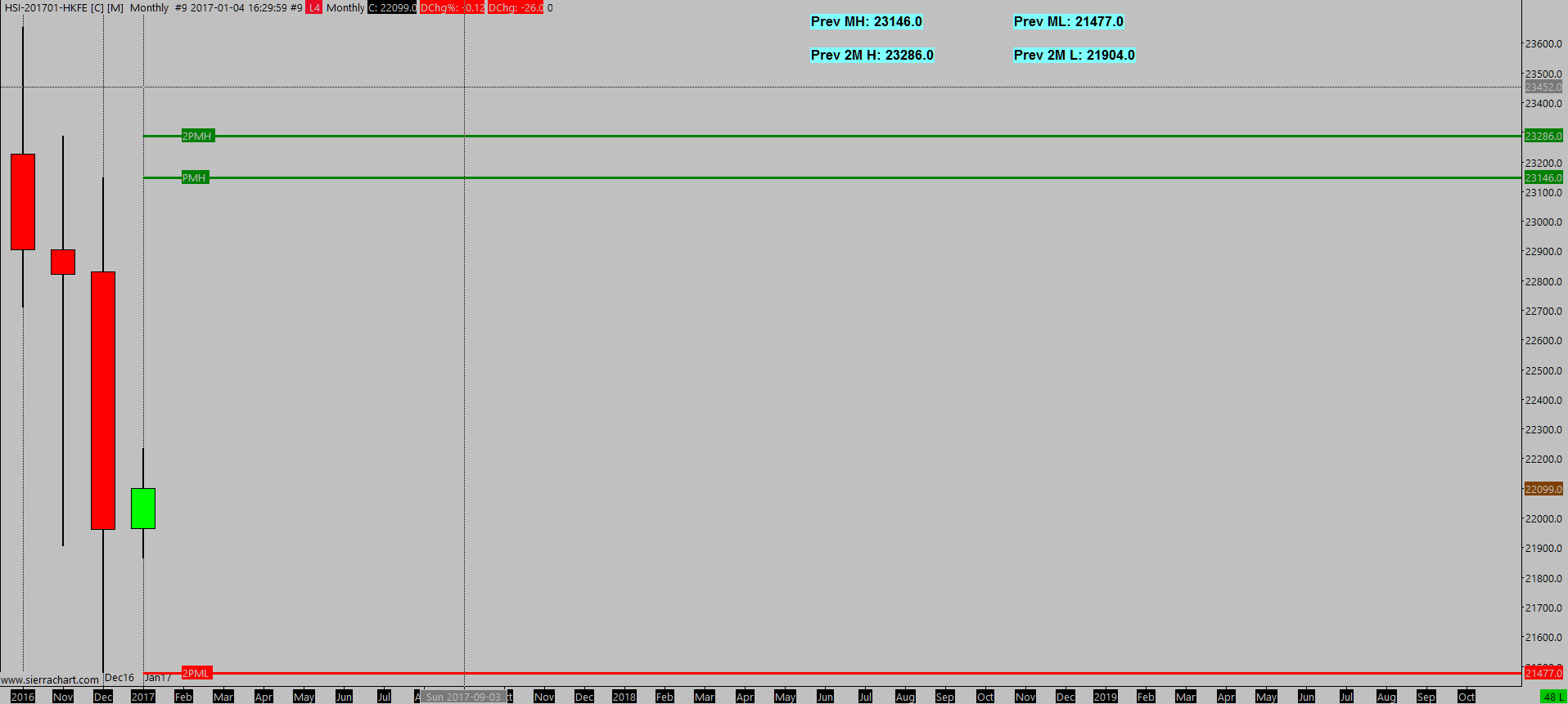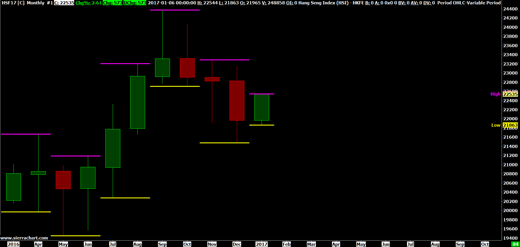 I tried to plot a line showing high & low of 2 months ago (i.e. November) in a monthly chart but failed. I used the study "Period OHLC - Variable Period" with "Time Period Type" set to Months and "Time Period Length" set to 2. I can view and verify the high in the monthly chart. However, the low appeared to be the low one month ago (i.e. December low). Pls check and advise. Thx.