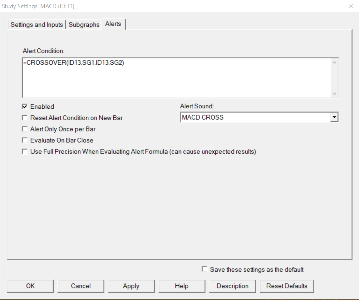 Sir, I went to the page with the various example of coding for implementing an alert: http://www.sierrachart.com/index.php?page=doc/StudyChartAlertsAndScanning.php#GeneralInformation I my case, I would like to set-up an alert when a candle touch the BB on a Daily Chart and another when the candle close having crossed the Bollinger Band. The code would be: =CROSSOVER(SG1, SG3) if SG1 is the BBTop and SG3 the BBLow ? ---------------------------------------- Besides, I have created a specific sound file in wav format placed in the Alertsound folder (sound that describe litteraly the action of a cross between the 2 curves of the MACD) Even If I have chosen it on the alert panel of the MACD indicator, it does not occur and I get systematically en error message: No Sound/email set in the Alert Manager. Do not know what to do... The code for the alert itself does not work, even if it is a copy and paste from one of the available example in the help area: =CROSSOVER(ID13.SG1.ID13.SG2) Is it a coma or a point that must separate SG1 from ID13 please ? See attached please. ---------------------------------------- Last, is it possible to choose sound file in mp3 format ? ---------------------------------------- Thanks in advance ! Date Time Of Last Edit: 2017-01-10 09:45:27