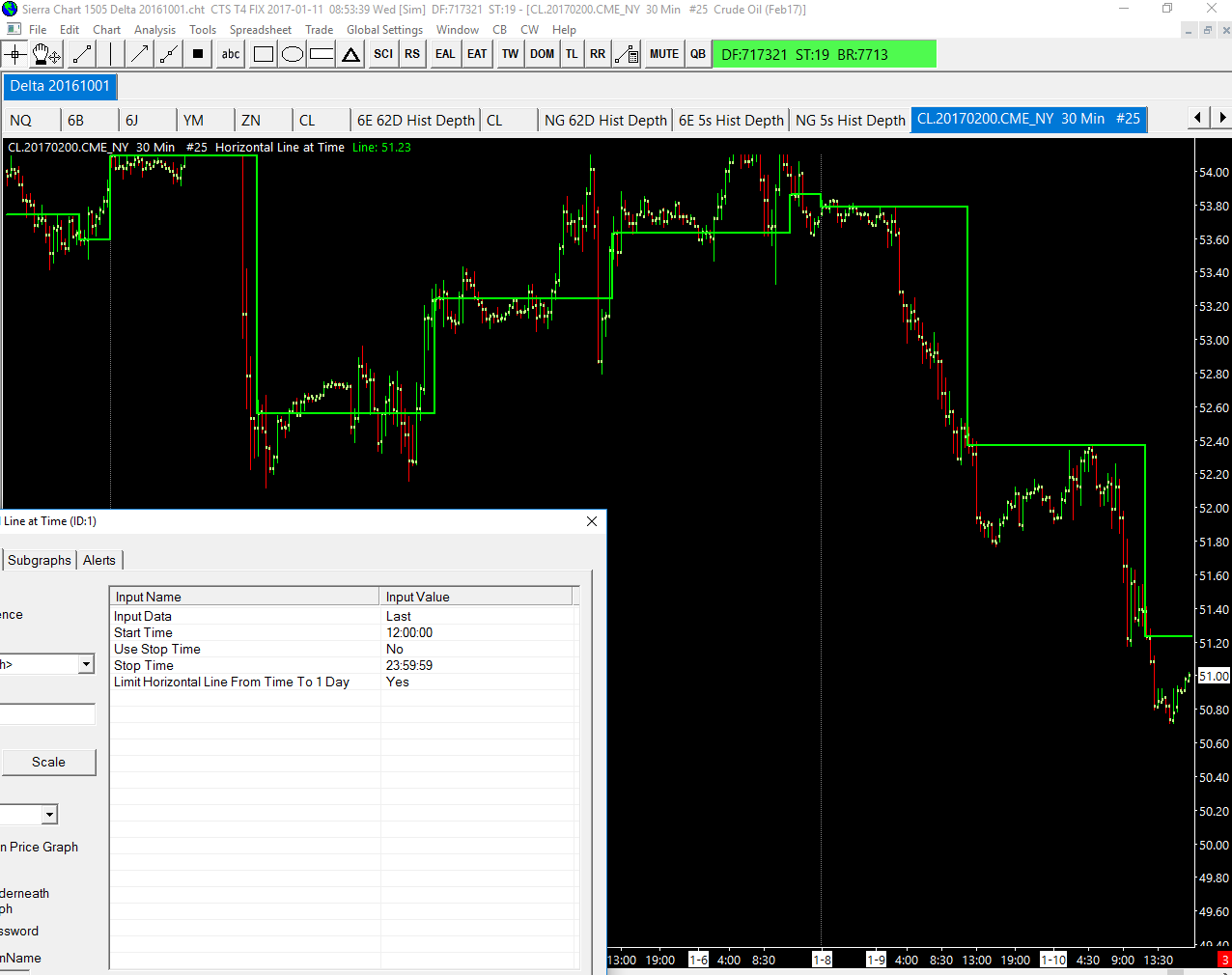 Hi I am using an ES futures chart: 30 minute bar period, intraday, session time 17:00:00 to 15:59:59. When using the "Horizontal Line at Time" Study, the Line re-initiates itself on the opening bar of a new week whatever settings I use in the study. Many Thanks |