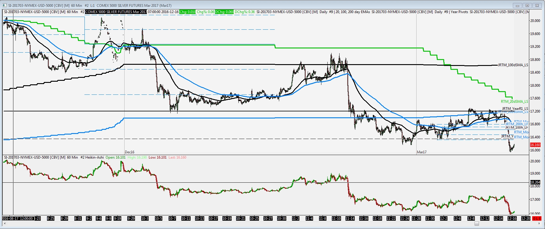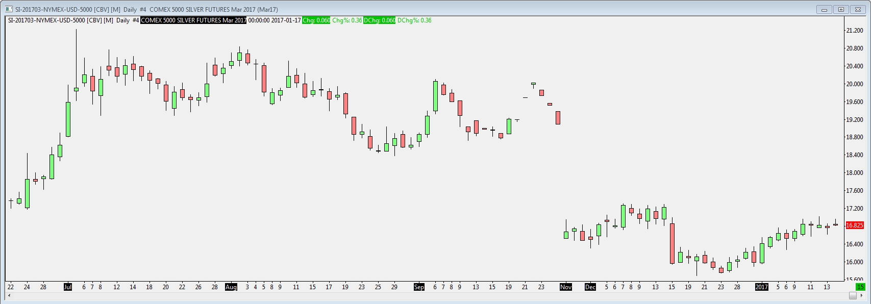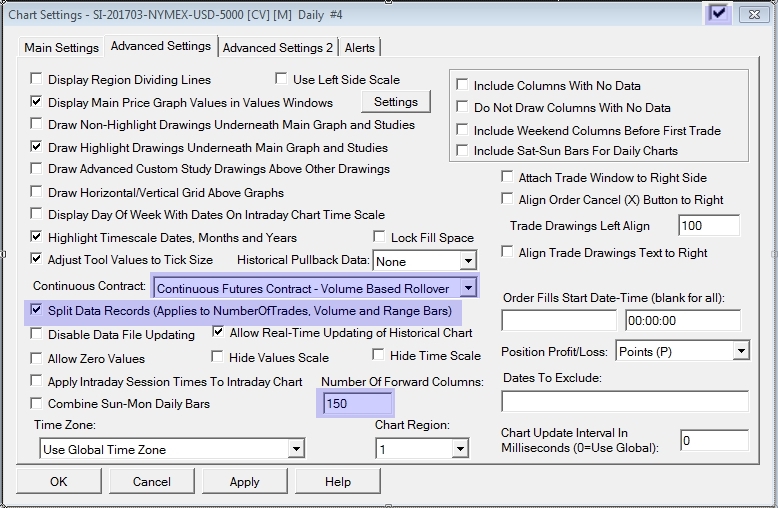 Hi, I just realised that my Silver continuous contracts all appear to be missing quite a lot of days in October and November. This appears to be related to the Continuous contract settings. It looks ok on intraday charts with continuous contracts. I've attached a series of screenshots showing my daily charts for each of the different "Continuous Contract" selections. You'll notice a large gap on the charts around Oct/Nov. I've also included a zoom in of the time in question. I'm not sure if this is relevant but If you look around 9-6 on the intraday data you can see an area of scattered bars which coincides with the subsequent problems. For the Continuous volume based back adjusted rollover. (the one I normally use) I see missing data from Tue 2016-09-28 until Mon 2016-11-27. Which is 2 calendar months. I hope this isn't my mistake again. I checked it with a fresh newly created chart window. Thanks again for your help with sc.EarliestUpdateSubgraphDataArrayIndex - I did google that before asking the question but at midnight to 3am I somehow failed to find it on any of the search results and spend several hours fiddling around with various settings uncertain of how to use it. It was only after reading your reply that I finally realised that I was using it correctly but my bug was because I was failing to zero a section of the subgraph values) -Jason |