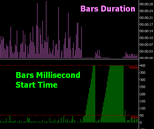 SC version 1007. 1. No bar has a start timestamp of over HH:MM:SS.400 (400ms) 2. Bars always have a start time which is very close to the "seconds" (__:__:SS.000) start. examples: Crude Oil 50 Volume bars = Bars start time is always less than HH:MM:SS.50 (50ms). Crude Oil 100 Volume bars = Bars start time is always less than HH:MM:SS.85 (85ms). There are two exceptions to #2: A. Either the bar's own duration is 1 second or less. B. Or the prior bar's duration is less than 1 second. Date Time Of Last Edit: 2013-08-09 12:50:38