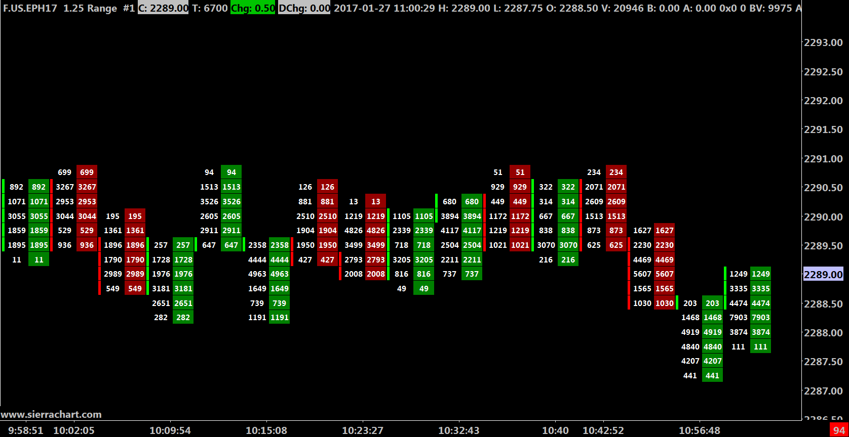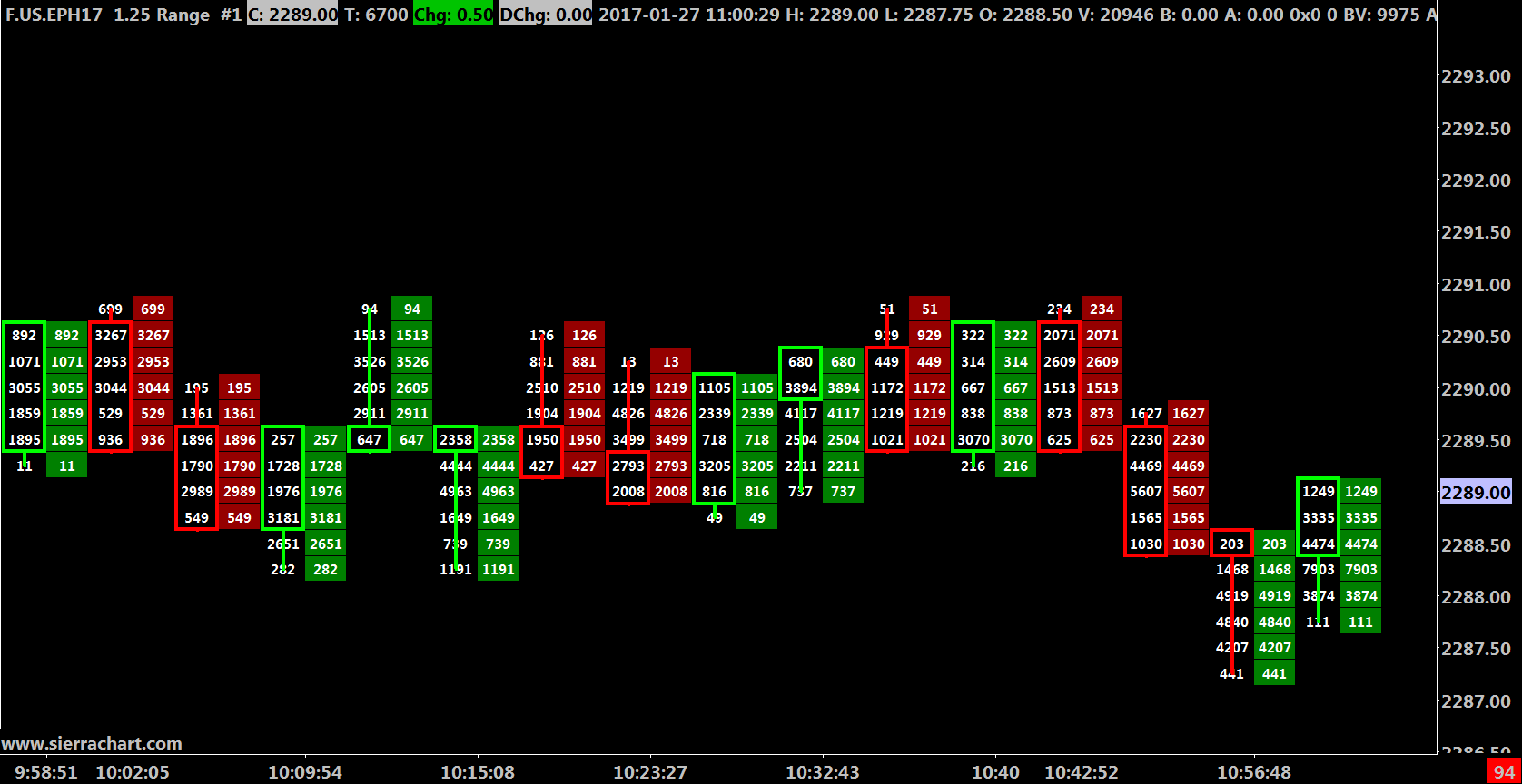 I apologize for not annotating the chart correctly. I used the dragonfly and gravestone doji terminology so that we could communicate more easily since that is an unambiguous nomenclature used in candlestick analysis. I don't understand why you say that the terms are nonspecific since when you google the terms and then click on images every single image of a dragonfly doji or a gravestone doji looks exactly the same. But fine, I'll be more verbose instead. So basically there are two kinds of bars that I want to draw your attention to. The first kind is the bar that goes up but then reverses course and closes back at the open ("Up kind" bar) The second kind is the bar that travels down, but then reverses direction and closes back up at the opening price ("Down kind" bar). First of all, I see what you mean by the Numbers Bar study simply following the standard method of candlestick bar coloring. Although that logic is twisted since a candlestick bar of the "Down kind" overcame all of the selling pressure and then bounced back up to its price of origin (opening price) which is highly bullish (green) instead of bearish (red)! Can you change that aspect of the code? Separately, I still don't understand why on image #1 above (Candlestick Outline), the second bar from the right on the chart (a down kind bar) is colored red when it has a candlestick outline but green otherwise. Shouldn't they both be either red or green? - in this case red since that's how the standard candlestick bar would be colored by your program. Curiously, there is full agreement in color (both are green, although it should be red) when one switches from the candlestick outline to "open to close boxes" - please see image #2 above. And ironically, the same type of discrepancy in coloration is not seen on 6th bar from the left on image #1. This image is a clearer example of the lack of consistency that I'm referring to (March 2017 ES contract on Tues 2017-01-31 at 9:45 AM): http://www.sierrachart.com/image.php?Image=1486093707651.png |