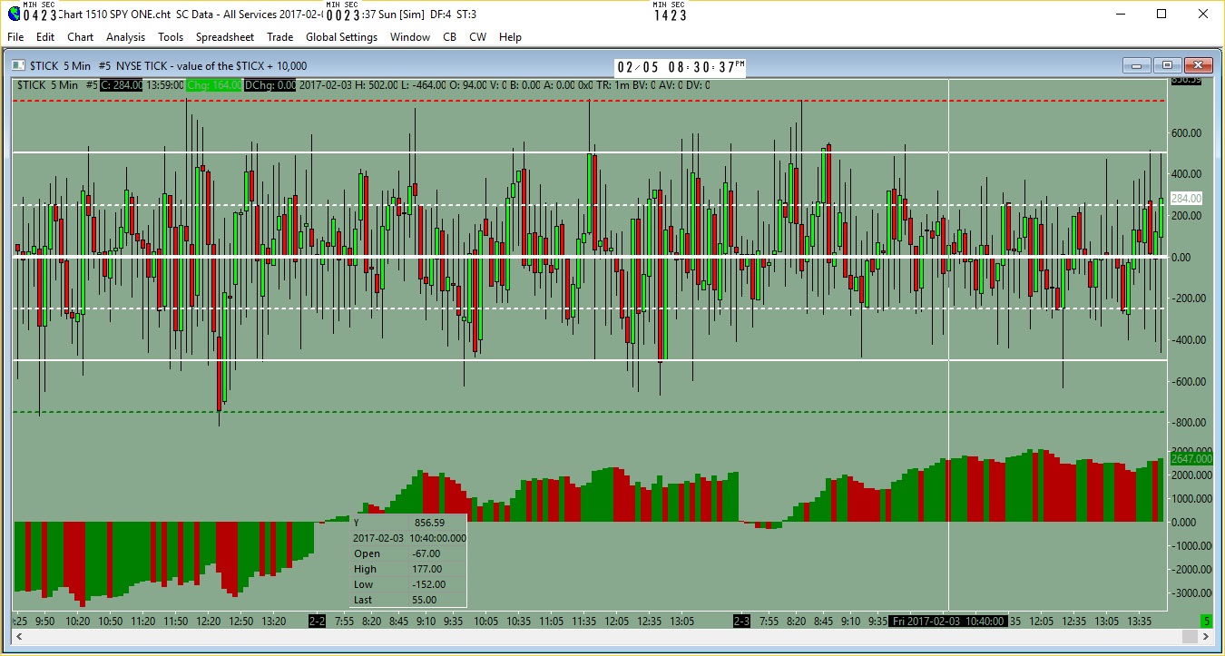 Hi, Thanks for the info. I don't want to argue the accuracy of your data. You may be correct in your analysis but for traders, its all about what data is actionable or can provide an edge. For me, I just find the NYSE $TICK that I get from my ameritrade account provides me an edge vs. your data. There may very well be traders who can trade off of the $TICK you provide but I am not able to do so. While having the datafeed attached to TDAmeritrade, I used the symbol $TICK and it pulls up data that is different from the $TICK chart when viewed within TOS platform. Within the TOS platform, the $TICK on 02/03/17 chart registered 10 incidences of +750 readings whereas when using your Sierra $TICK, there was only 1 incidence of +750 reading. In my book that is a big difference. Any ideas on how I can get the same $TICK chart in Sierra that matches the $TICK chart in TOS? Sorry for being a pain about this and appreciate your patience. TIA