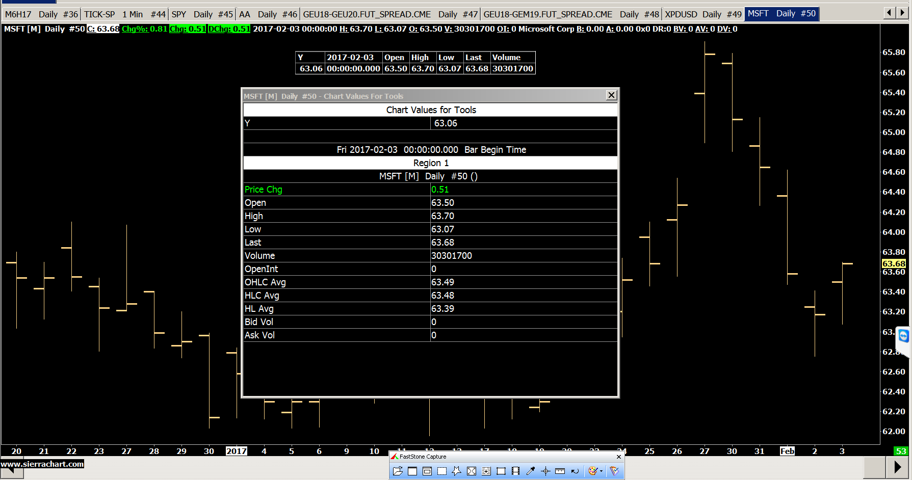 | Here is the data for the full 24 hours of trading: Fri 2017-02-03 00:00:00.000 Bar Begin Time Region 1 MSFT [M] 1 Day #50 () Price Chg: 0.00 Open: 63.18 High: 63.70 Low: 63.07 Last: 63.58 Volume: 28325064 # of Trades: 125359 OHLC Avg: 63.38 HLC Avg: 63.45 HL Avg: 63.39 Bid Vol: 12819598 Ask Vol: 15505508 Sierra Chart Support - Engineering Level Your definitive source for support. Other responses are from users. Try to keep your questions brief and to the point. Be aware of support policy: https://www.sierrachart.com/index.php?l=PostingInformation.php#GeneralInformation For the most reliable, advanced, and zero cost futures order routing, *change* to the Teton service: Sierra Chart Teton Futures Order Routing |
