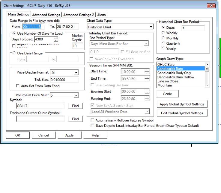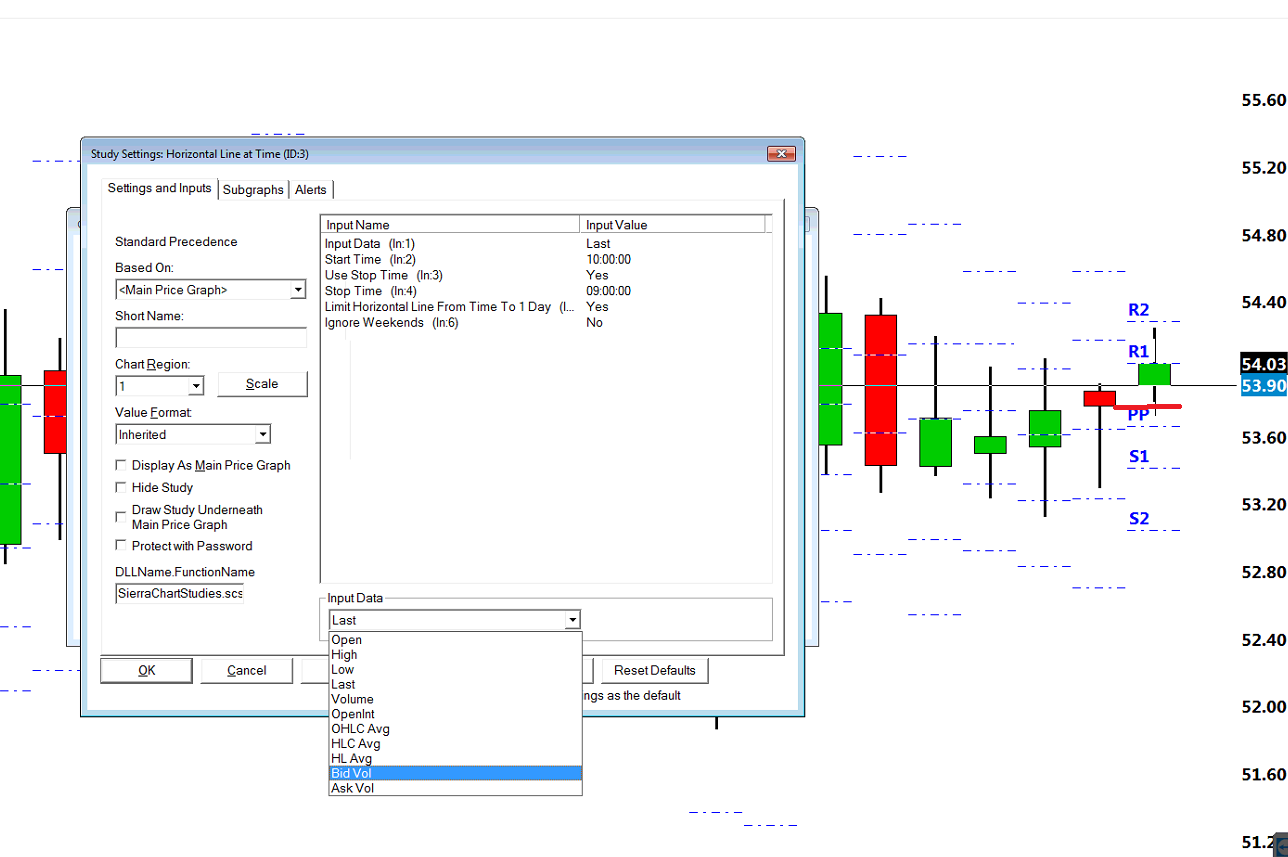 Hmmm, still having same issue of not drawing the close, using version 1522 I'm attaching a snap of the session times configuration, if it might help. The actual session times are: The open is at 10:00 Sydney time and close at 09:00 for Crude CL. But using the 59's in the configuration, which also works. I have fiddled with the stop and start times in the "Horizontal Line at Time Study"'s "Settings and Inputs" tab (redline.png), but no luck. Am I right to use LAST as Input Data, assuming it will be the closing price at the session close? It would make it easier to have Close in the dropdown, but I'm sure there is a good reason it want included. It would be nice to have each days close recorded, but if it is too complex, just having the last Close price in a horizontal (across all days) would be good enough, and is assumed to be a frequent request. -J |