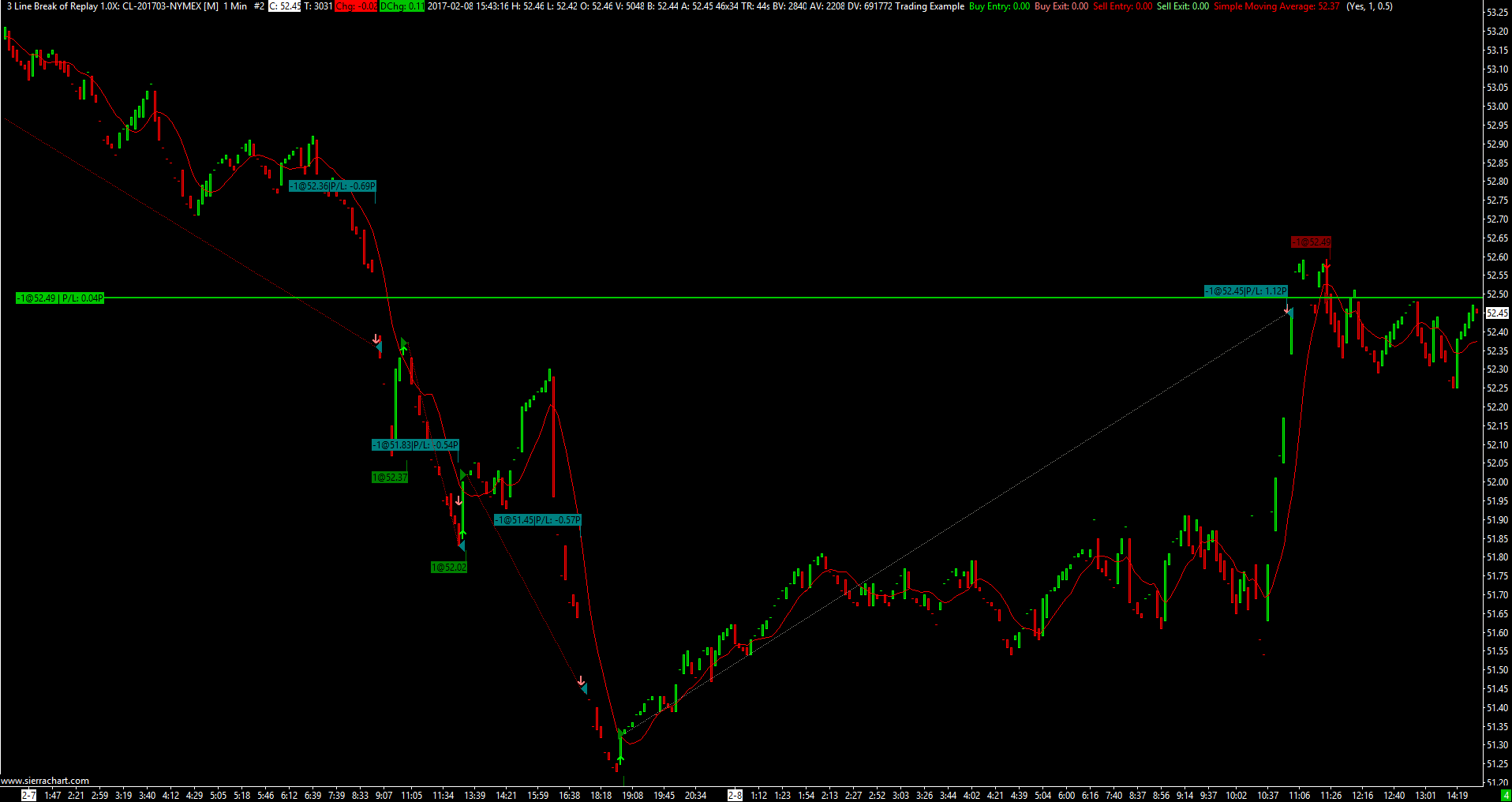 Thanks for your help. Here are what I did - I start from scratch here and am repeating the steps while typing this message: 1. Open a new intraday chart ("CL-201703-NYMEX"). In the Chart Settings, set "Days to load" to 10, and "Graph Draw Type" to Candlestick Bars. 2. Enable Trade->Show Order Fills. 3. Add the "Three Line Break Chart" study, and set "Show Real Open" to "Yes". This would lead to the following clean chart: http://www.sierrachart.com/image.php?Image=1486591617543.png 4. Add the "Trading Example" study, set "Enabled" to yes, "Target Value" to 1 and "Stop Value" to 0.5. 5. Perform Trade->"AutoTrade System Bar Based BackTest". The following chart is resulted: http://www.sierrachart.com/image.php?Image=1486592190696.png 6. Now, I perform Trade->"AutoTrade System Replay BackTest" (which took much longer), everything becomes normal again: http://www.sierrachart.com/image.php?Image=1486592600502.png Not sure why this happened. Thanks again. |