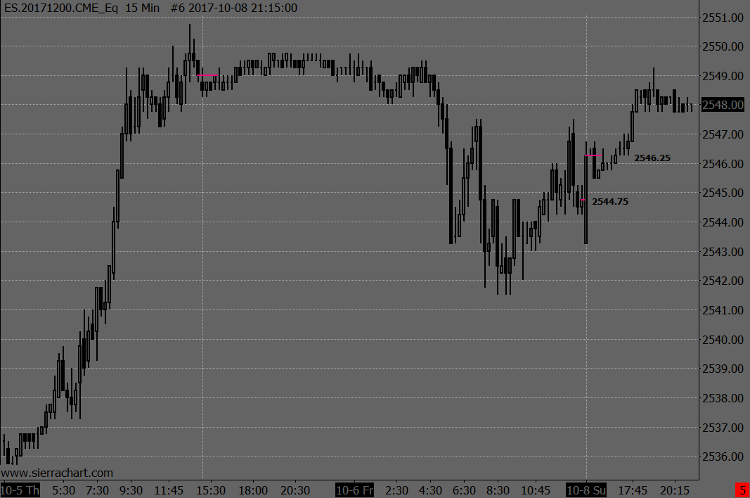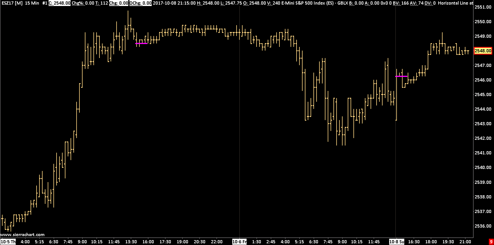 We are not on the same page here. Your study is indicating the last traded price of the first bar of each session. I was talking about the last traded price of the last bar of each session. For ES, if you used the setting shown in the attached image, you'd see this as I initially described: http://www.sierrachart.com/image.php?Image=1507726981855.png My chart has exactly the same number of bars as the one you posted. As you can see, the last traded price for 10/6 Friday is 2544.75 The line stops extending when Sunday opens, and it draws a new line from the last traded price of the first bar of the session at 2546.25 The line for the last trade price of 10/5 Thu is working as it should per the setting. |
