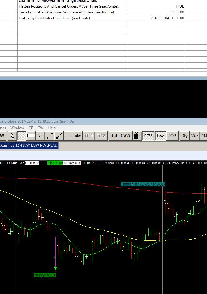 Good morning, Yes, Auto is enabled. I tried the replay and it does work---but found this issue(see image)---not sure why it would take a double position when the formula is "=AND($J$5=0,CK3>0)"? And the second order is the one that did not sell at 3:55. =AND($J$5=0,CK3>0)---this is sheet2--cell K3. http://www.sierrachart.com/image.php?Image=1487081868365.png Here is the sell formula: =AND($J$10>1000) Flatten Postitions is set to TRUE at 15:55:00 Thanks for all your help, Cy |