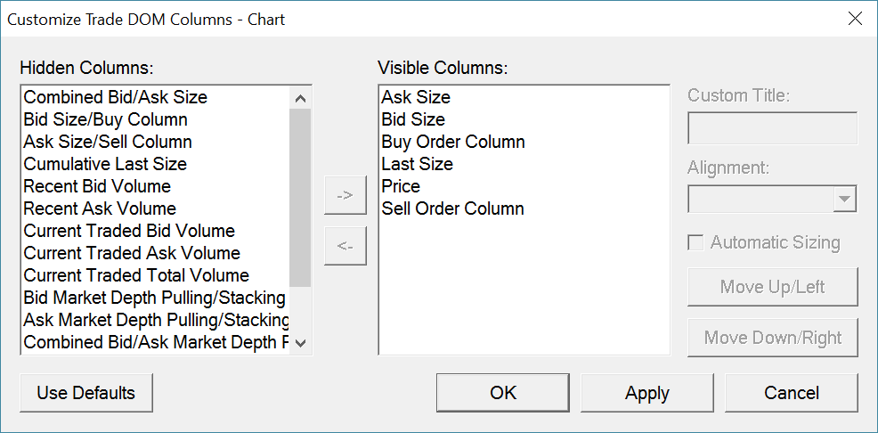 Refer to: Chart Trading and the Chart DOM: Customizing Trade DOM and Chart DOM Columns Sierra Chart Support - Engineering Level Your definitive source for support. Other responses are from users. Try to keep your questions brief and to the point. Be aware of support policy: https://www.sierrachart.com/index.php?l=PostingInformation.php#GeneralInformation For the most reliable, advanced, and zero cost futures order routing, *change* to the Teton service: Sierra Chart Teton Futures Order Routing |