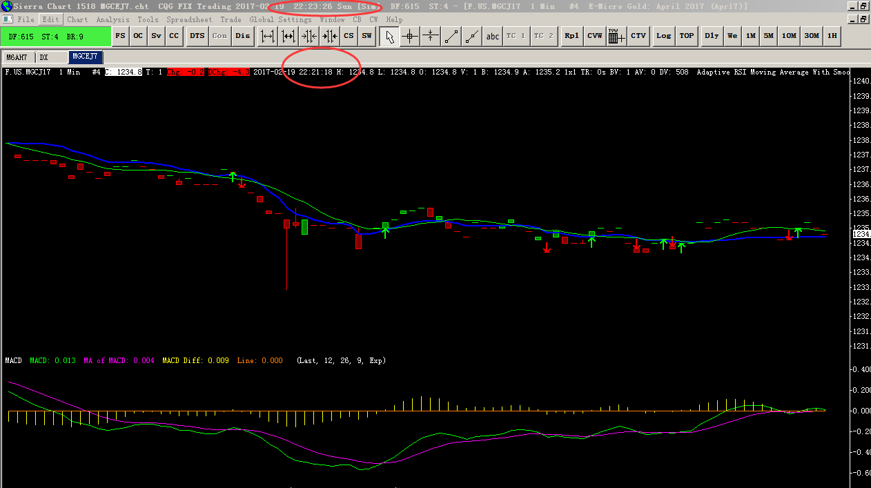 The micro gold futures infrequently trades and that is why the last trade time at the top line of the chart is behind the current time on the title bar. The USDX index updates nearly every second. So most of the time it is going to match the current time on the title bar. Sierra Chart Support - Engineering Level Your definitive source for support. Other responses are from users. Try to keep your questions brief and to the point. Be aware of support policy: https://www.sierrachart.com/index.php?l=PostingInformation.php#GeneralInformation For the most reliable, advanced, and zero cost futures order routing, *change* to the Teton service: Sierra Chart Teton Futures Order Routing Date Time Of Last Edit: 2017-02-20 18:52:27