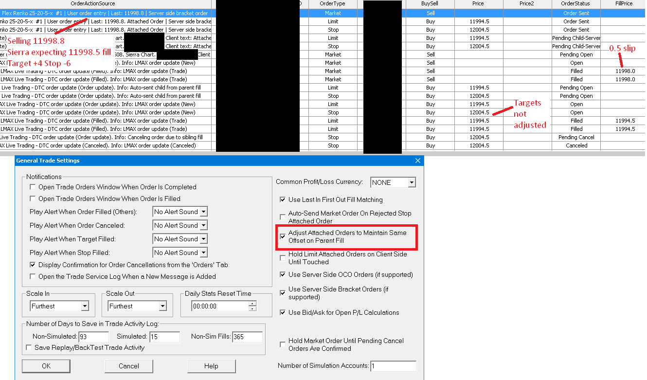 We now realize the reason for the problem. There is nothing wrong. The adjustment does not occur with a market order because there is no reference price given with the market order. We are testing a solution to this but it is only going to be released into the demo system for a couple of weeks before it goes live. Sierra Chart Support - Engineering Level Your definitive source for support. Other responses are from users. Try to keep your questions brief and to the point. Be aware of support policy: https://www.sierrachart.com/index.php?l=PostingInformation.php#GeneralInformation For the most reliable, advanced, and zero cost futures order routing, *change* to the Teton service: Sierra Chart Teton Futures Order Routing |
