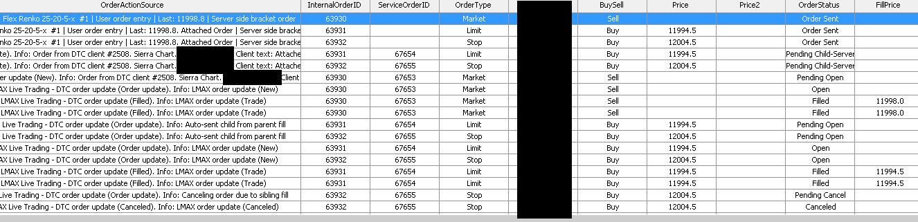 We need the Internal Order ID number of the parent order. Could you provide that. We will also do testing on the demo system. We would not expect a problem with this. So we will have to look into it. Sierra Chart Support - Engineering Level Your definitive source for support. Other responses are from users. Try to keep your questions brief and to the point. Be aware of support policy: https://www.sierrachart.com/index.php?l=PostingInformation.php#GeneralInformation For the most reliable, advanced, and zero cost futures order routing, *change* to the Teton service: Sierra Chart Teton Futures Order Routing Date Time Of Last Edit: 2017-02-22 17:51:05