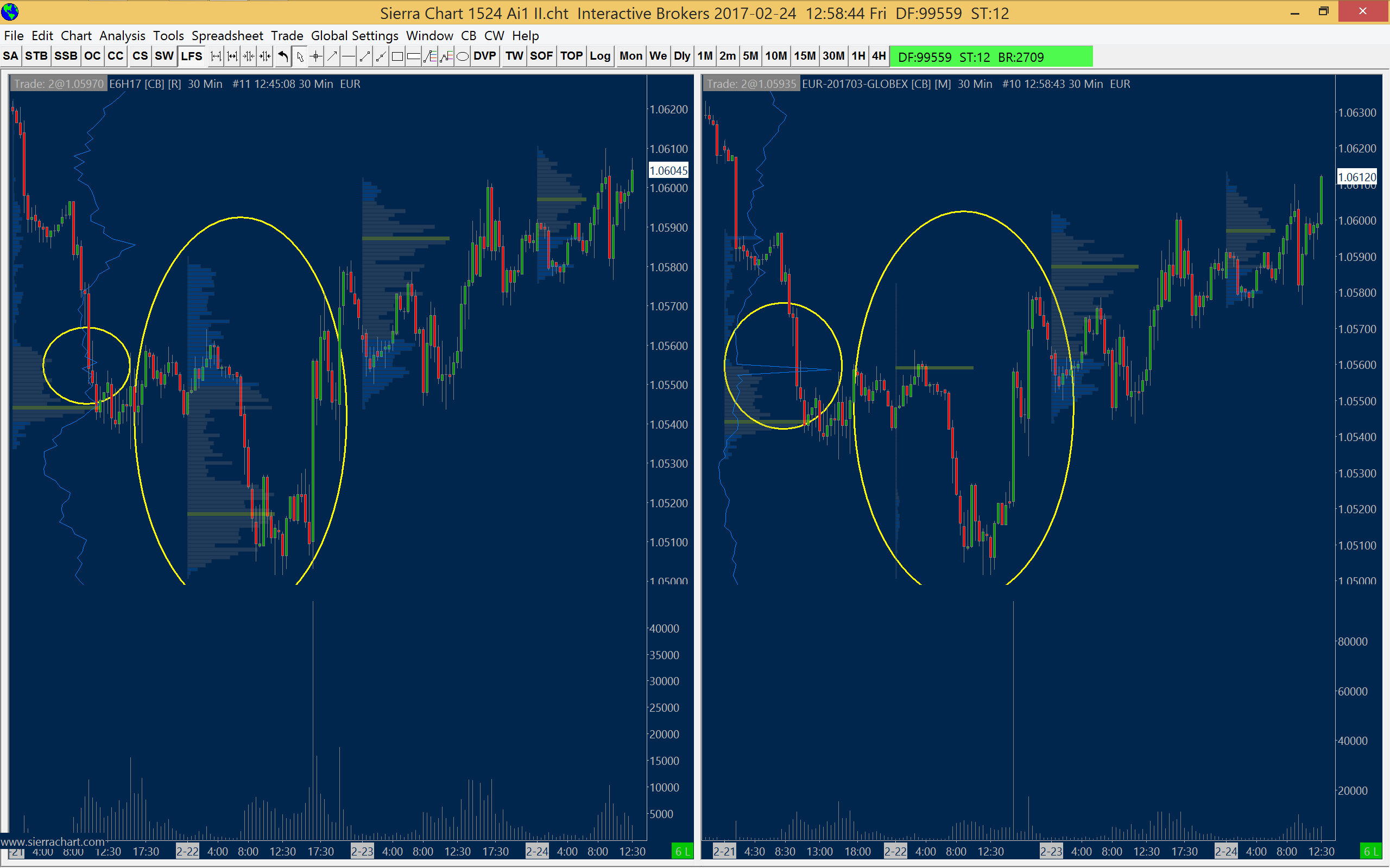 Using remote chart data files is not the proper method to receive data from the Sierra Chart Exchange Data Feed. There is no reason to use this method. It is no longer considered supported. What we want you to do for the chart on the right side, is to select that chart and then re-download the data by selecting Edit >>Delete All Data and Download. This will ensure the data is correct. If you want to share data between instances of Sierra Chart, then refer to: Using DTC Server for Data and Trading in Another Sierra Chart Instance: Using DTC Server for Data and Trading in Another Sierra Chart Instance Sierra Chart Support - Engineering Level Your definitive source for support. Other responses are from users. Try to keep your questions brief and to the point. Be aware of support policy: https://www.sierrachart.com/index.php?l=PostingInformation.php#GeneralInformation For the most reliable, advanced, and zero cost futures order routing, *change* to the Teton service: Sierra Chart Teton Futures Order Routing |