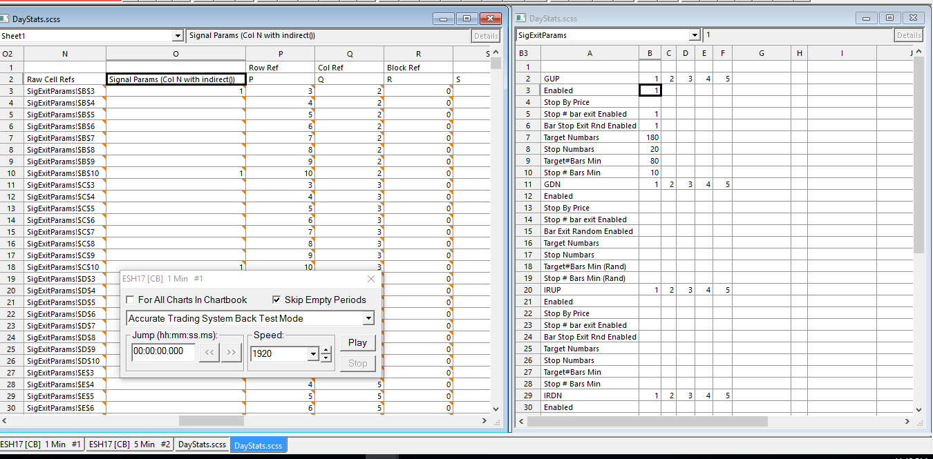 Ok, I have included a chart book and spreadsheet file adhering to the outlined specs above. Description Of Spreadsheet/ChartBook: -There are a couple custom studies that are on my version. With the custom studies the only factor that may have an impact is sc.EarliestUpdateIndex is set to sc.ArraySize-50 in one of the studies when !sc.IsFullRecalculation. -There Are 2 sheets int the spreadsheet study "DayStats" to concern yourself with: 1. SigExitParams: sheet that is not for Chart Data input, and is not an output. It simply is a place to enter settings. 2. Sheet1: -Subgraph Columns N-R are the columns to concern yourself with. -Column O is the only column used for Output and contains ordered Cell Refs to "SigExitParams" sheet. -the rest are helper columns That are used to Help O get the correct Cell Ref to sheet "SigExitParams". Steps to Duplicate Problem: 1. Open The Chart Book. 2. Compare the Values in 'Sheet1' O3:O10 to the Values in 'SigExitParams' B3:B10. They will Identical in descending Order. 3. Change one or some of the cell values in 'SigExitParams' B3:B10. 4. Go to the Chart and Hit Recalculate. 5. Repeat step 2 - The Values in both arrays are supposed to remain Identicel but 'Sheet1' O3:O10 is not reflecting the new values. |