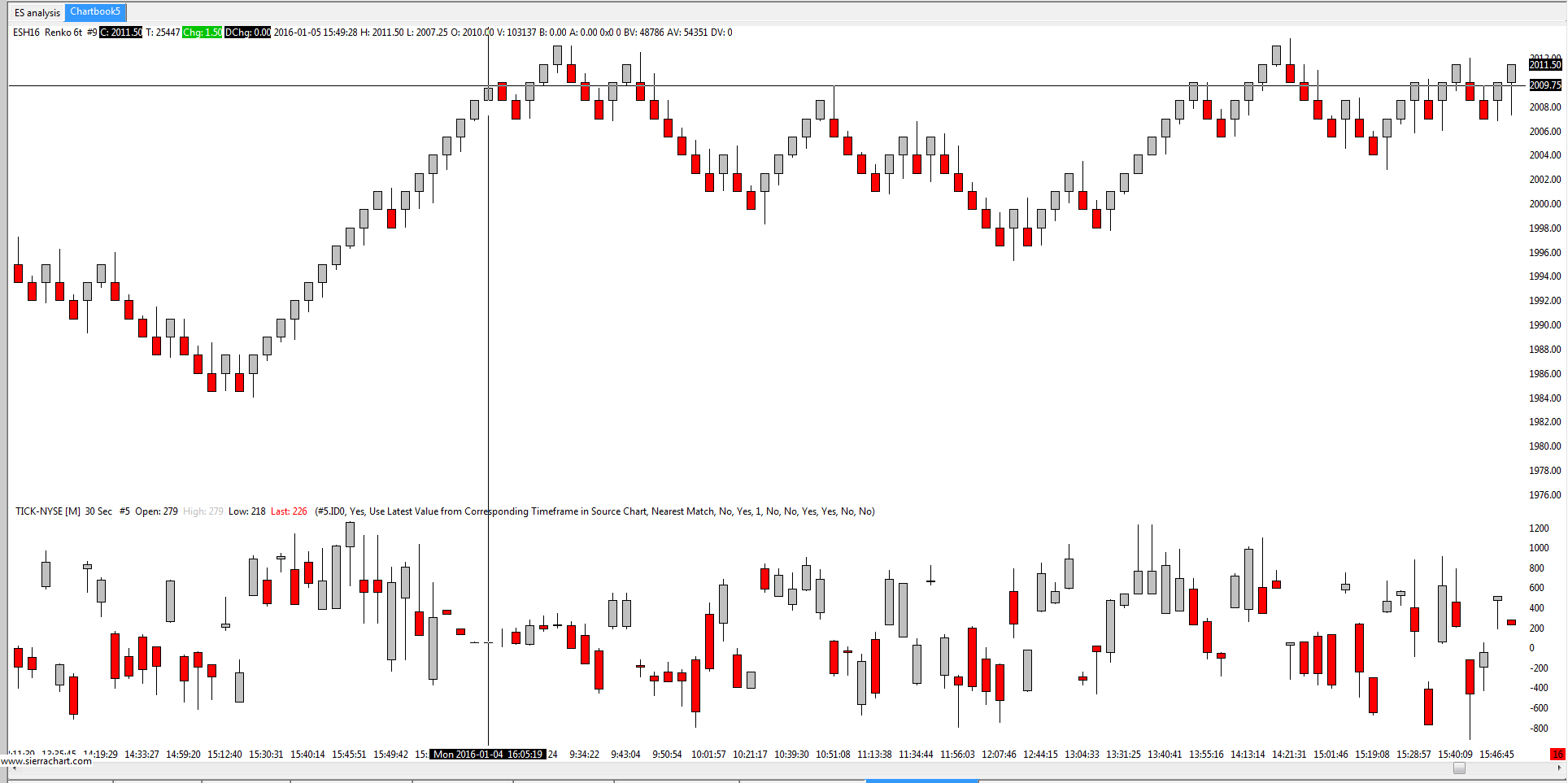 Hi, I'm a relatively new user to Sierra. I'm looking to overlay the NYSE TICK on my 6 tick renko chart for the ES. As you can see from the image attached there's gaps in the data. I'm sure i'm overlooking something small - I have played around with the settings. NYSE TICK chart is set to 30 seconds. Any suggestions, please? I have used Market Delta in the past and I was able to overlay the TICK and Advance / Decline with no gaps or issues. Thanks, Tom http://www.sierrachart.com/image.php?Image=1488111458625.png |