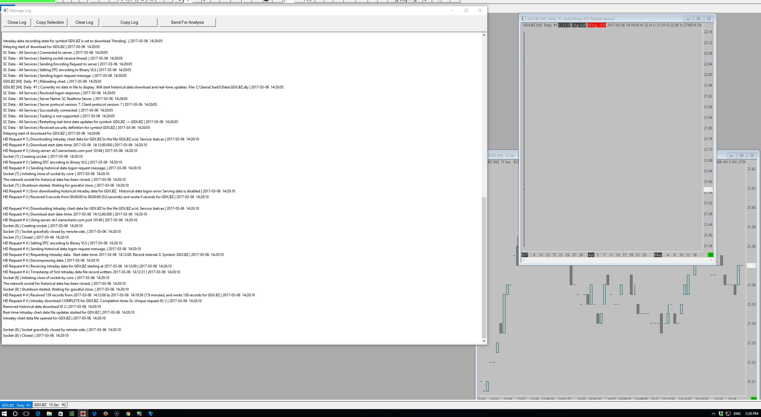 Reading Internal Order ID file. | 2017-03-06 14:17:05 Reading Trade Orders file. | 2017-03-06 14:17:05 Reading Trade Positions file. | 2017-03-06 14:17:05 Software version: 1522 | 2017-03-06 14:17:05 Uses New Spreadsheets | 2017-03-06 14:17:05 Enabled for: Advanced Features. | 2017-03-06 14:17:05 Enabled for: Advanced Features 2. | 2017-03-06 14:17:05 Enabled for: Sierra Chart Historical Data Service. | 2017-03-06 14:17:05 Enabled for: Sierra Chart Real-Time Exchange Data Feed. | 2017-03-06 14:17:05 Enabled for: INDEXES_DATA_BARCHART | 2017-03-06 14:17:05 Enabled for: CME (Trading Account Required) | 2017-03-06 14:17:05 Enabled for: CBOT (Trading Account Required) | 2017-03-06 14:17:05 Enabled for: COMEX (Trading Account Required) | 2017-03-06 14:17:05 Enabled for: NYMEX (Trading Account Required) | 2017-03-06 14:17:05 Enabled for: BATS (NYSE, NASDAQ) | 2017-03-06 14:17:05 Received 1 data feed usernames. | 2017-03-06 14:17:05 Allow Support for Sierra Chart Data Feeds is enabled. | 2017-03-06 14:17:05 Current selected Data/Trading service: SC Data - All Services | 2017-03-06 14:17:05 Chart Update Interval: 100 | 2017-03-06 14:17:05 Time Zone: -05:00:00 (EST-05EDT+01,M3.2.0/02:00,M11.1.0/02:00) | 2017-03-06 14:17:05 2017-03-06 14:17:08 Local computer time | 2017-03-06 14:17:05 2017-03-06 19:17:08 Local computer time in UTC | 2017-03-06 14:17:05 2017-03-06 14:17:08 Local computer time in SC Time Zone | 2017-03-06 14:17:05 2017-03-06 19:17:08 Server time in UTC | 2017-03-06 14:17:05 Local computer UTC time and Server UTC time difference: 0 seconds. | 2017-03-06 14:17:05 Program path: C:\SierraChart3\ | 2017-03-06 14:17:05 Data Files path: C:\SierraChart3\Data\ | 2017-03-06 14:17:05 OS Version Number: 6.2 | 2017-03-06 14:17:05 Locale Setting: C | 2017-03-06 14:17:05 Checking for new symbol settings for service code scdataallservices | 2017-03-06 14:17:05 HTTPS connection to www.sierrachart.com:443 (3) | Creating socket. Using TLS 1.2. | 2017-03-06 14:17:05 HTTPS connection to www.sierrachart.com:443 (4) | Creating socket. Using TLS 1.2. | 2017-03-06 14:17:11 Symbol settings are up-to-date for scdataallservices | 2017-03-06 14:17:14 SC Data - All Services | Connected to data server. | 2017-03-06 14:17:14 HTTPS connection to www.sierrachart.com:443 (4) | Socket gracefully closed by remote side. | 2017-03-06 14:17:16 HTTPS connection to www.sierrachart.com:443 (4) | Received socket Close event | 2017-03-06 14:17:16 HTTPS connection to www.sierrachart.com:443 (4) | Initiating close of socket by core. | 2017-03-06 14:17:16 HTTPS connection to www.sierrachart.com:443 (4) | Graceful close received or receive error. Shutdown complete. Closing socket now. | 2017-03-06 14:17:16 HTTPS connection to www.sierrachart.com:443 (4) | Closed. | 2017-03-06 14:17:16 HTTPS connection to www.sierrachart.com:443 (3) | Socket gracefully closed by remote side. | 2017-03-06 14:17:19 HTTPS connection to www.sierrachart.com:443 (3) | Received socket Close event | 2017-03-06 14:17:19 HTTPS connection to www.sierrachart.com:443 (3) | Initiating close of socket by core. | 2017-03-06 14:17:19 HTTPS connection to www.sierrachart.com:443 (3) | Graceful close received or receive error. Shutdown complete. Closing socket now. | 2017-03-06 14:17:19 HTTPS connection to www.sierrachart.com:443 (3) | Closed. | 2017-03-06 14:17:19 GDX.BZ Daily #1 | Reloading chart. | 2017-03-06 14:20:04 GDX.BZ 15 Sec #2 | Reloading chart. | 2017-03-06 14:20:04 GDX.BZ Daily #1 | Currently no data in file to display. Will start historical data download and real-time updates. File: C:\SierraChart3\Data\GDX.BZ.dly | 2017-03-06 14:20:04 Mapping GDX.BZ to GDX.BZ. Service code: bats.ex | 2017-03-06 14:20:05 SC Data - All Services | Starting real-time market data updates for: GDX.BZ. ID: 1 | 2017-03-06 14:20:05 SC Data - All Services | Using username 0 | 2017-03-06 14:20:05 SC Data - All Services | Connecting to the server ds1.sierracharts.com. Port 10047 | 2017-03-06 14:20:05 DTC Client (6) | Creating socket. | 2017-03-06 14:20:05 SC Data - All Services | Requesting security definition data for: GDX.BZ. ID: 1 | 2017-03-06 14:20:05 HD Request # 2 | Downloading Historical Daily chart data for GDX.BZ. Starting date: 1967-03-07. Service: bats.ex | 2017-03-06 14:20:05 HD Request # 2 | Error downloading historical Daily data for GDX.BZ. The symbol or data type is not supported with your account type. | 2017-03-06 14:20:05 HD Request # 2 | Received 0 records from 00:00:00 to 00:00:00 (0.0 seconds) and wrote 0 records for GDX.BZ | 2017-03-06 14:20:05 HD Request # 2 | Daily download COMPLETE for GDX.BZ. Completion time: 0s. Unique request ID: 1 | 2017-03-06 14:20:05 Removed historical data download ID 1 | 2017-03-06 14:20:05 Intraday data recording state for symbol GDX.BZ is set to download 'Pending'. | 2017-03-06 14:20:05 Delaying start of download for GDX.BZ | 2017-03-06 14:20:05 SC Data - All Services | Connected to server. | 2017-03-06 14:20:05 SC Data - All Services | Starting socket receive thread. | 2017-03-06 14:20:05 SC Data - All Services | Sending Encoding Request to server | 2017-03-06 14:20:05 SC Data - All Services | Setting DTC encoding to Binary VLS | 2017-03-06 14:20:05 SC Data - All Services | Sending logon request message. | 2017-03-06 14:20:05 GDX.BZ [M] Daily #1 | Reloading chart. | 2017-03-06 14:20:05 GDX.BZ [M] Daily #1 | Currently no data in file to display. Will start historical data download and real-time updates. File: C:\SierraChart3\Data\GDX.BZ.dly | 2017-03-06 14:20:05 SC Data - All Services | Received logon response. | 2017-03-06 14:20:05 SC Data - All Services | Server Name: SC Realtime Server. | 2017-03-06 14:20:05 SC Data - All Services | Server protocol version: 7. Client protocol version: 7 | 2017-03-06 14:20:05 SC Data - All Services | Successfully connected. | 2017-03-06 14:20:05 SC Data - All Services | Trading is not supported. | 2017-03-06 14:20:05 SC Data - All Services | Restarting real-time data updates for symbol: GDX.BZ 