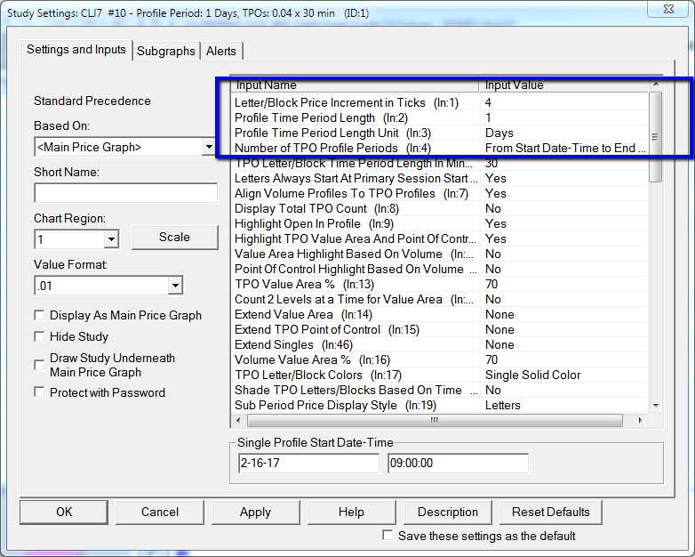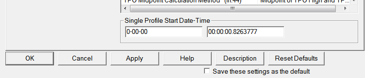 Regarding this section: http://www.sierrachart.com/index.php?page=doc/StudiesReference/TimePriceOpportunityCharts.html#TPOProfileSettings From Start Date-Time + Time Length: This will create a single TPO Profile from the starting Date-Time specified by the Single Profile Start Date-Time Input. The profile links is specified by the Profile Time Period Length and Profile Time Period Type Inputs. Please see the attached images 1 and 2 for my settings. When I push apply, I get the results shown in image 3. (date reverts to 0 and the time is a little strange looking, definitely not what I entered) The chart itself (image 4) looks good, but I can't be sure it's accurate because the date/time at the bottom doesn't display as I had indicated. Can you point me in the right direction as to where I am going wrong? |