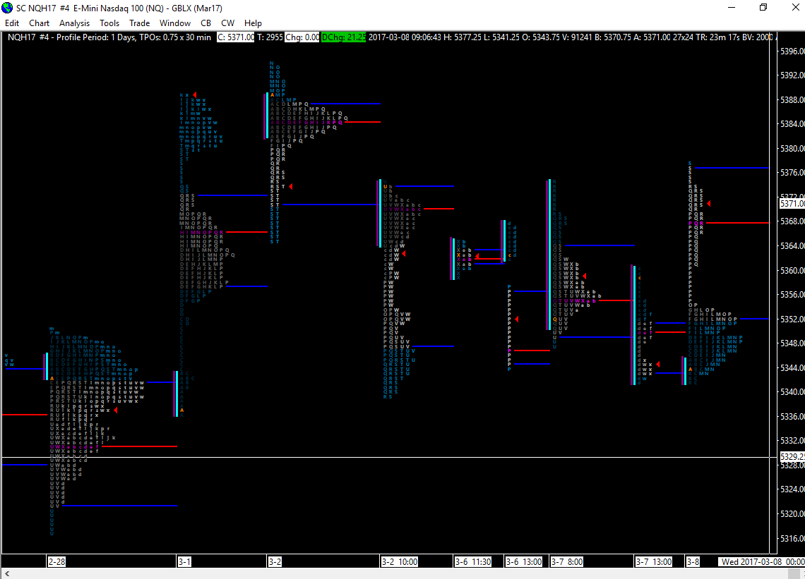 Can I get a Chartbook of the TPO indicator with the following: Letters instead of blocks Plot the Initial Balance Plot the Open Extend POV & VAH & VAL Have the start be 7:30 (Mountain Time for me) and the end go throughout the globex session (i.e. 1 market profile per day starting at the New York open time) Attached is what I have. I think I'm close, but it looks off when I compare it to my Volume By Price chart, which has all of the above settings. Thank you very much for the help. Craig Schultz |