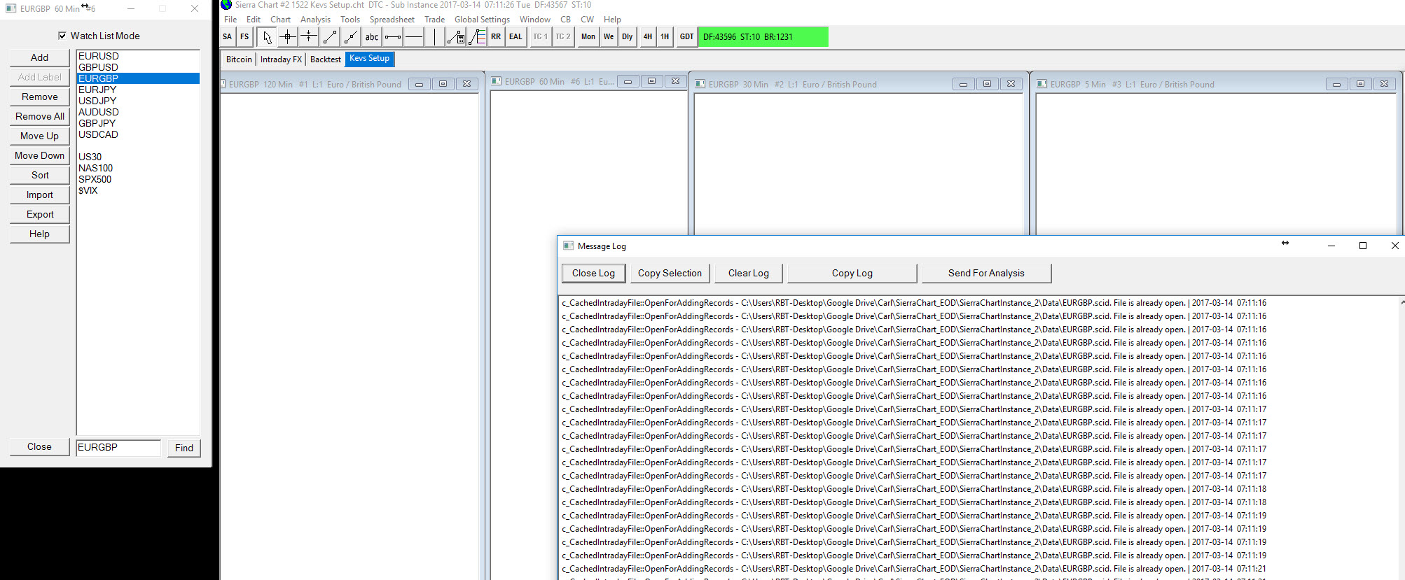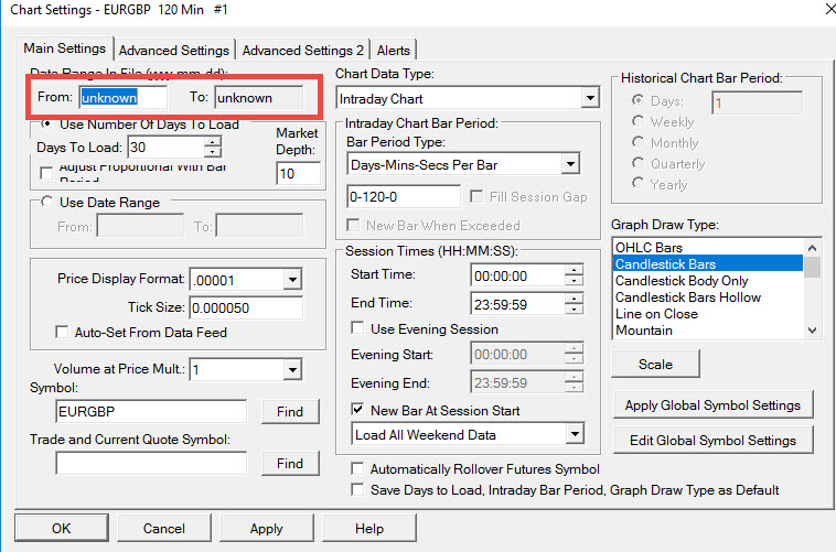 EURGBP 60 Min #6 | Reloading chart. | 2017-03-14 07:12:50 Failed to get dates from Intraday data file. Header check failed when opening the file C:\Users\RBT-Desktop\Google Drive\Carl\SierraChart_EOD\SierraChartInstance_2\Data\EURGBP.scid for reading. Error: Unknown Intraday file type. File: C:\Users\RBT-Desktop\Google Drive\Carl\SierraChart_EOD\SierraChartInstance_2\Data\EURGBP.scid | 2017-03-14 07:12:50 * Unknown Intraday file type. C:\Users\RBT-Desktop\Google Drive\Carl\SierraChart_EOD\SierraChartInstance_2\Data\EURGBP.scid | 2017-03-14 07:12:50 * Error opening or reading chart data file. File: C:\Users\RBT-Desktop\Google Drive\Carl\SierraChart_EOD\SierraChartInstance_2\Data\EURGBP.scid | 2017-03-14 07:12:50 * c_CachedIntradayFile::OpenForAddingRecords - C:\Users\RBT-Desktop\Google Drive\Carl\SierraChart_EOD\SierraChartInstance_2\Data\EURGBP.scid. File is already open. | 2017-03-14 07:12:50 c_CachedIntradayFile::OpenForAddingRecords - C:\Users\RBT-Desktop\Google Drive\Carl\SierraChart_EOD\SierraChartInstance_2\Data\EURGBP.scid. File is already open. | 2017-03-14 07:12:50 c_CachedIntradayFile::OpenForAddingRecords - C:\Users\RBT-Desktop\Google Drive\Carl\SierraChart_EOD\SierraChartInstance_2\Data\EURGBP.scid. File is already open. | 2017-03-14 07:12:50 Will post full log if needed Also see image (blank chart). I noticed that in Chart settings the Dates To and From were Unknown. I haven't restarted SC since I have some positions in and I get an alert that Orders held Client Side will no longer be managed so not sure if to restart. I am only in Demo so i can restart this wouldn't be a problem but wasn't even sure if this would fix it. If you need anything further please advise. |