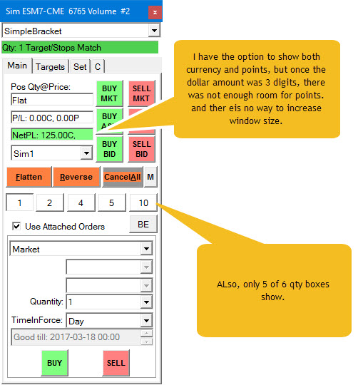 The width of the Trade Window cannot be changed and therefore you cannot see long text strings for the Profit/Loss values. You will only see the full 6 Quantity buttons on the Compact tab of the Trade Window. However, we will increase this to 6 for the main tab. Sierra Chart Support - Engineering Level Your definitive source for support. Other responses are from users. Try to keep your questions brief and to the point. Be aware of support policy: https://www.sierrachart.com/index.php?l=PostingInformation.php#GeneralInformation For the most reliable, advanced, and zero cost futures order routing, *change* to the Teton service: Sierra Chart Teton Futures Order Routing Date Time Of Last Edit: 2017-03-17 19:01:17