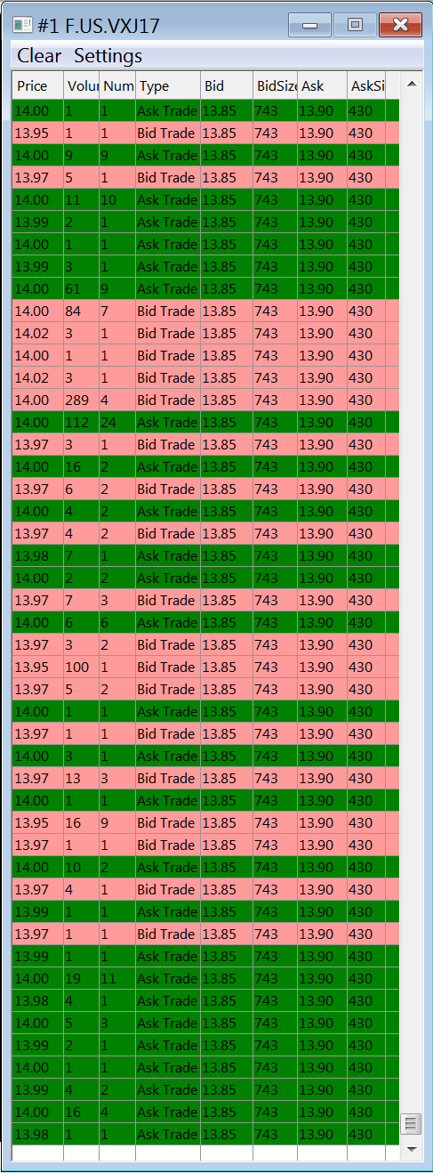 CME: Just checked & yes, I have market depth. Bid & ask are fine. CFE: Understood re: market depth. Still not getting live bid & ask. It repaints them upon a manual delete & download, but live data isn't appearing. They freeze at the point last updated. Time and sales won't update at all. Last trade price is still good. |