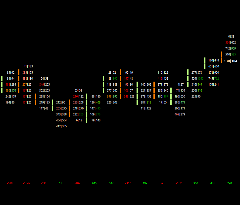 Hi, I am testing Sierra Charts, because it seems to fit very well for me. But I am an enthusiast of footprint charts, and using Numbers Bars study I get strange data. In Market Delta or Multicharts footprints, most of the bars has a 0 in bid at the high of the bar, and a 0 in ask at the low. Bars with numbers different from 0 in the high or low are just a few, and in fact, they have a name: unfinished auction, which give trading oportunities. But with Numbers Bars, the equivalent to footprint, almost every bar has bid and ask different from 0 in both high and low of the bar. I attach an image. Probably I am doing something wrong, but I need to know how to avoid it and have actual unfinished auction footpring bars. Also, I would know which study have I to use to have colored bars instead of numbers in the bottom of the chart of the screen capture. It shows the net balance of the bar (sell market orders - buy market orders). I want to draw a bar, not a number. Which study need I to use? Thanks |