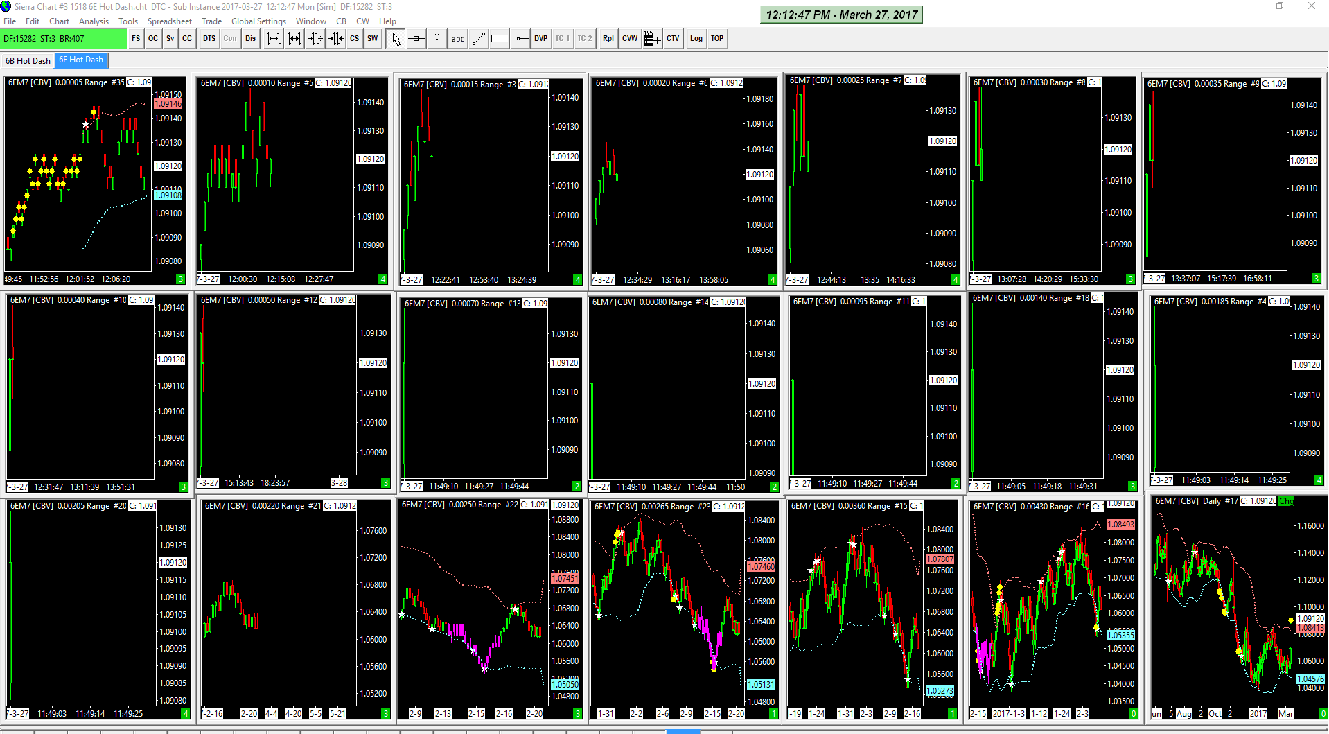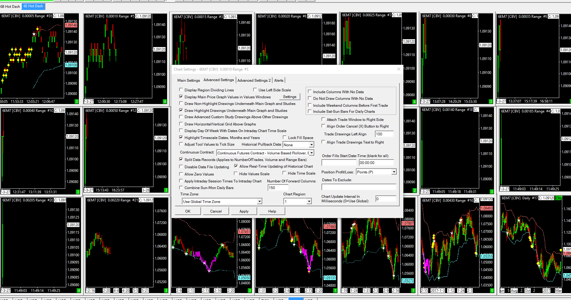 I have just logged on after a month or so since my last logon. I've updated the rollover for 6EM7. I have 21 screens of varying ranges. All charts are set to using sierra chart continuous contract data. A lot of the screens are showing only data from logon. Can you advise? see attached.