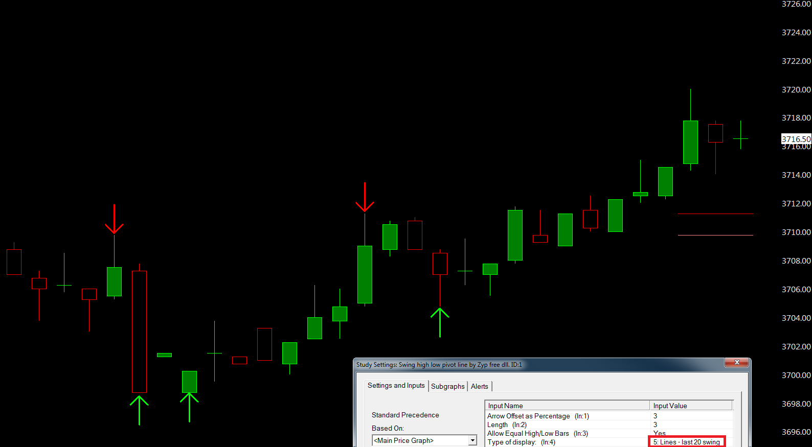 I am trying to create a color bar when the last swing bar low (highlighted by an arrow) is higher than than the previous swing bar low. The swing bar low is ID1.SG2 and the length is 3. I'm still not sure what the length means in the indicator. I currently have =AND(ID1.SG2[-3]>ID1.SG2[-6],C[-3]>C[-6]) and it works, but it colors the bar way after the swing bar arrow comes on the screen. Essentially I want to color a bar as soon as the swing low is shower a higher low. Thanks |