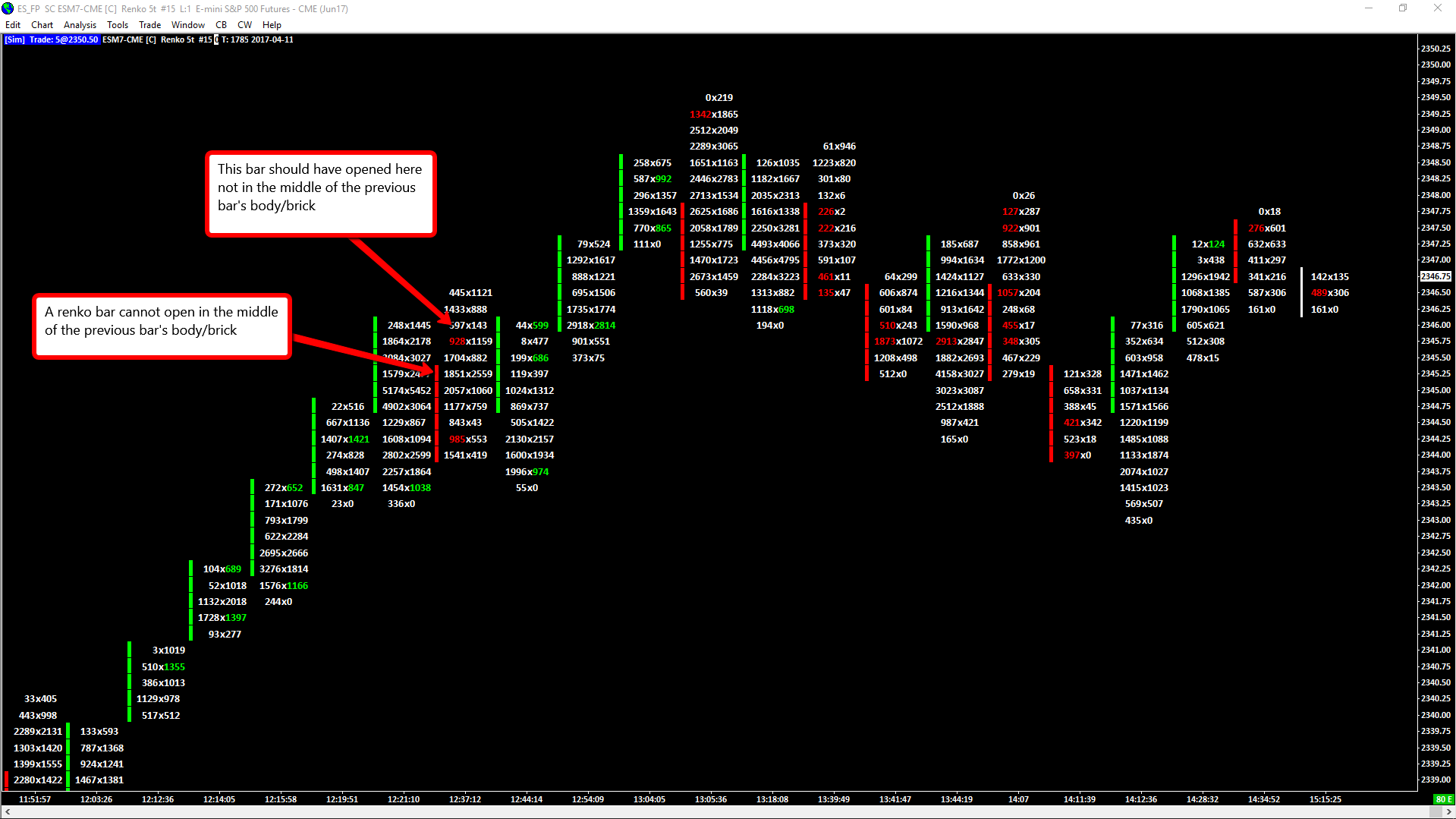 This is what we were concerned with the change that was made and there was going to be some further analysis we were going to be doing today related to this to make sure everything is working as expected. For now we have to revert this change. The Renko bars was worked on by another developer that is no longer with us. At this point we just have to rebuild the Renko code from scratch and organize it differently. Allow about 60 days for this. This is just yet another thing, which is setting us back with our development schedule. One thing to keep in mind is the particular price level that you see that has 1 | 0 or 0 | 1, can just be ignored. It is only a single trade. Sierra Chart Support - Engineering Level Your definitive source for support. Other responses are from users. Try to keep your questions brief and to the point. Be aware of support policy: https://www.sierrachart.com/index.php?l=PostingInformation.php#GeneralInformation For the most reliable, advanced, and zero cost futures order routing, *change* to the Teton service: Sierra Chart Teton Futures Order Routing Date Time Of Last Edit: 2017-04-11 21:28:35