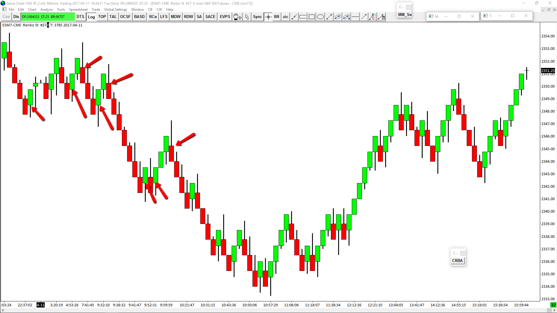 The 1x0 problem seems to be resolved but when I look at the bars they do not look like correct Renko bars. Attached is an image of a 5t Renko bars chart. One example of a bar that seems wrong to me is shown on the image. As far as undersdand (and as seen in this image from the SC documentation of Renko bar charts) https://www.sierrachart.com/images/RenkoBars.png - A renko bar will always open either at the open or the close price of the previous bar. As seen in the attached image this not the case with my renko chart. Prerelease 1542 (But I dont think this issue started at 1542). Date Time Of Last Edit: 2017-04-11 19:20:07