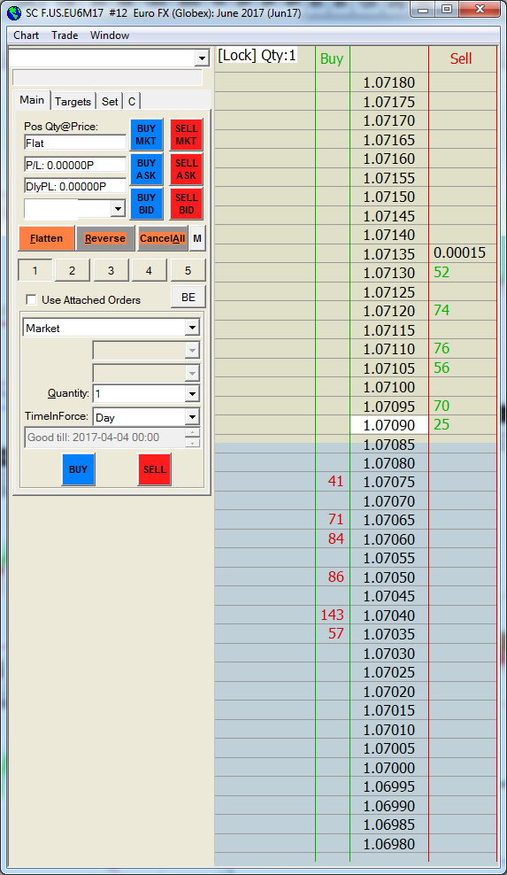 The EuroFX contract trades in half-ticks (changed over a year ago). The DOM is in full-ticks. Thats why quantities seem to be between lines. I guess adjusting the symbol-settings or chart-settings of the DOM accordingly should fix this.