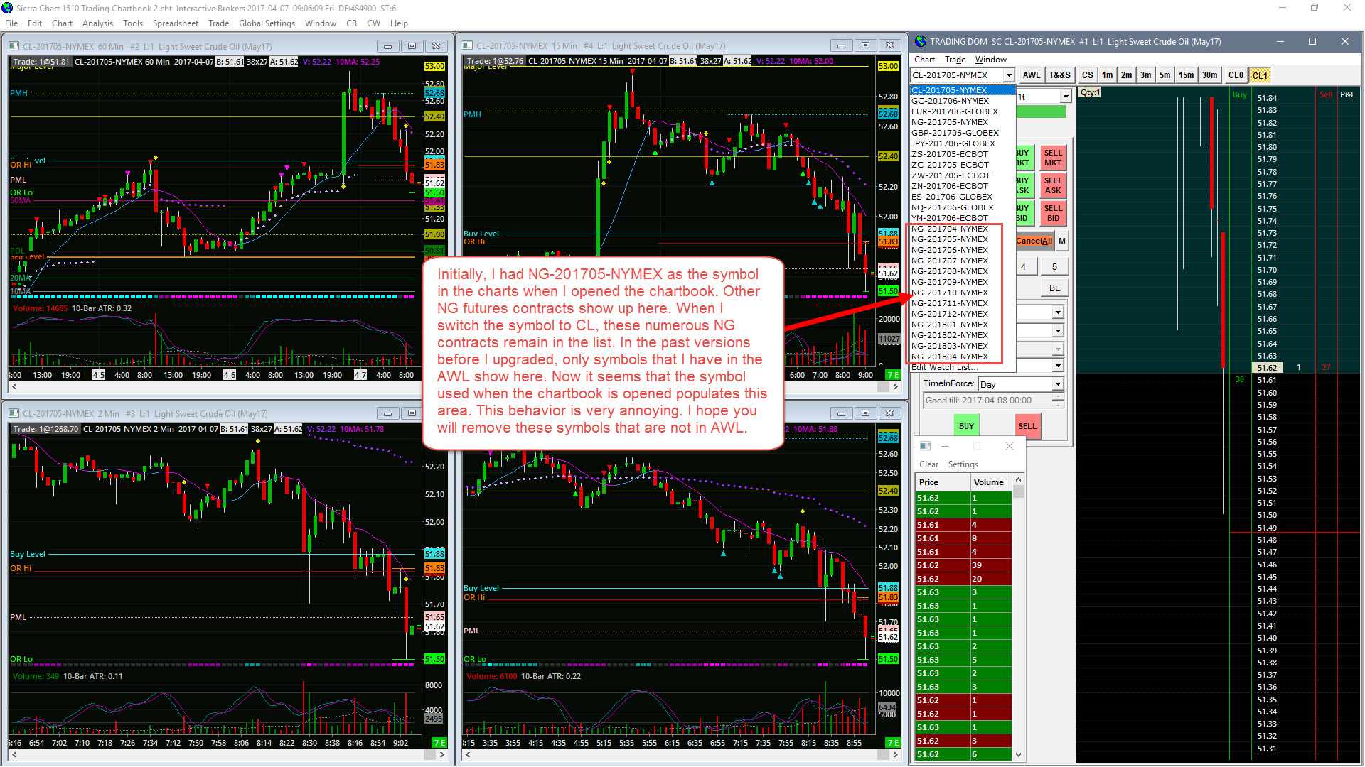We do see a problem with the watchlist symbols, and we will fix that but it is designed to show the additional contract months for the symbol of the chart.