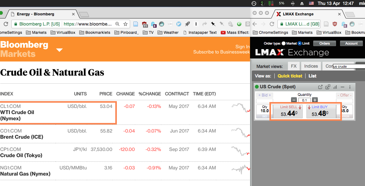 I have noticed that Crude XTI (and Brent) is always more expensive on the LMAX trading venue. I am curious why is this so? What market forces are causing this to happen? I understand this is not strictly a SierraChart question; its rather specific to LMAX, but I only trust the people on this forum. Bloomberg = $53.04 LMAX Xti = $53.48 This difference is always there. It is surprising to me. The other instruments are very close to the normal market price. Date Time Of Last Edit: 2017-04-13 13:59:46
