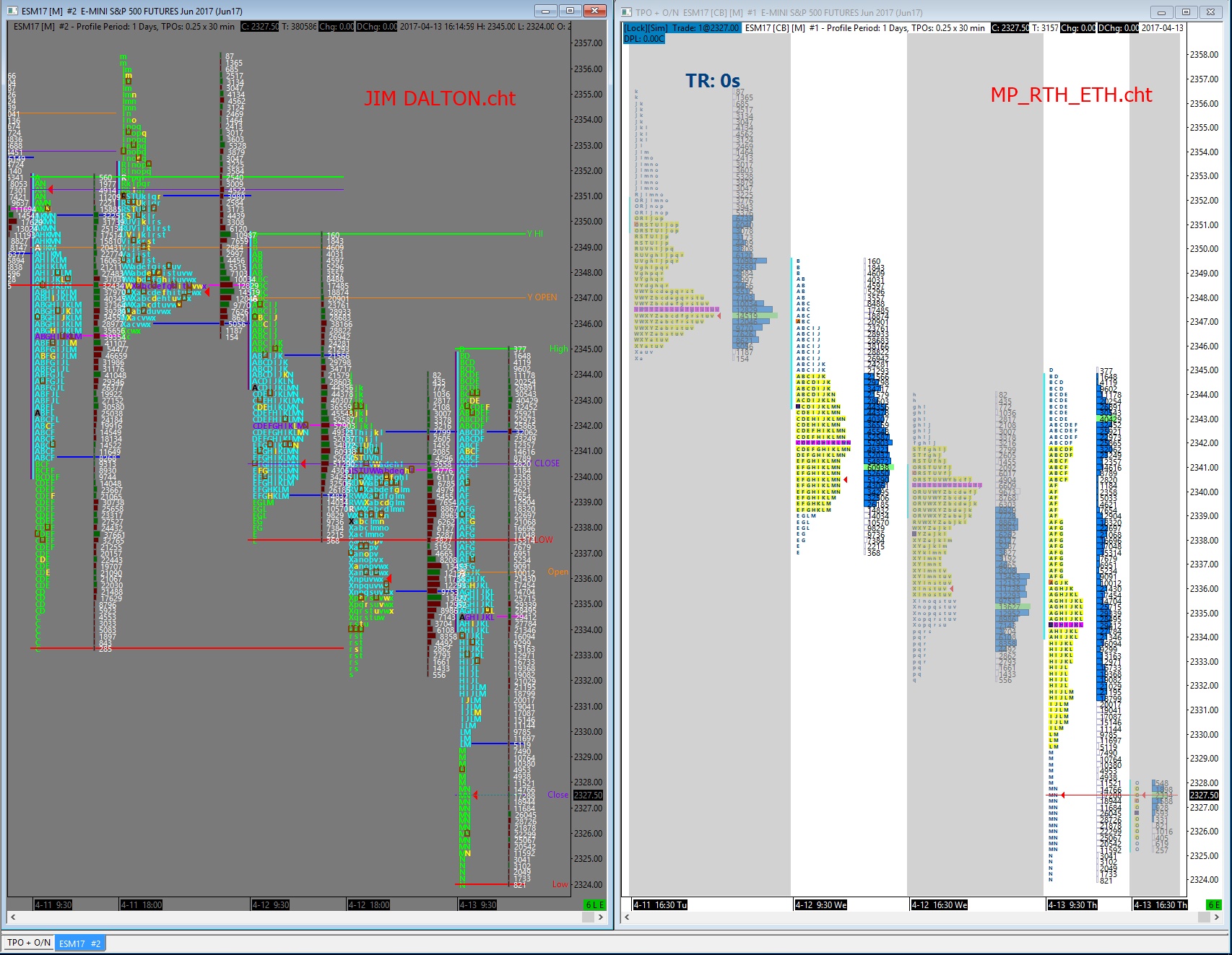 @User94606 I would like to get your perspective on market profile given that you have more experience in using it in your trading. I am trying to assess whether or market profile works. I have the following questions: 1. Do you use market profile in trading the e-minis primarily? do you use in equities trading? >> I use it primarily for the /ES, I rarely trade equities. 2. How long have you been using market profile? >> 2-3 years now, I also use Volume Profile, they each have their place in the toolbox. 3. What works and what does not work with market profile >> Not sure what you mean with this one. It's a different way to organize the data for each auction session, as opposed to looking at a standard bar chart. It also shows value area, POC, VPOC and other info. 4. Would you recommend market profile for someone to learn it? >> Yes. 5. How did you learn market profile? Did you take a class? >> Yes, I took the Jim Dalton intensive last year and it was worth every penny and then some. Check the following link: https://futures.io/vendors-product-reviews/39008-james-dalton-intensive-2016-a.html >> Check out futures.io it's a great board with tons of info on Market Profile, Volume Profile, trading and is a great place to learn and gain knowledge. >> Also, I would imagine that the Sierra Chart Engineering bro's would appreciate us not using the support board for general trading convo's Date Time Of Last Edit: 2017-04-19 00:59:07